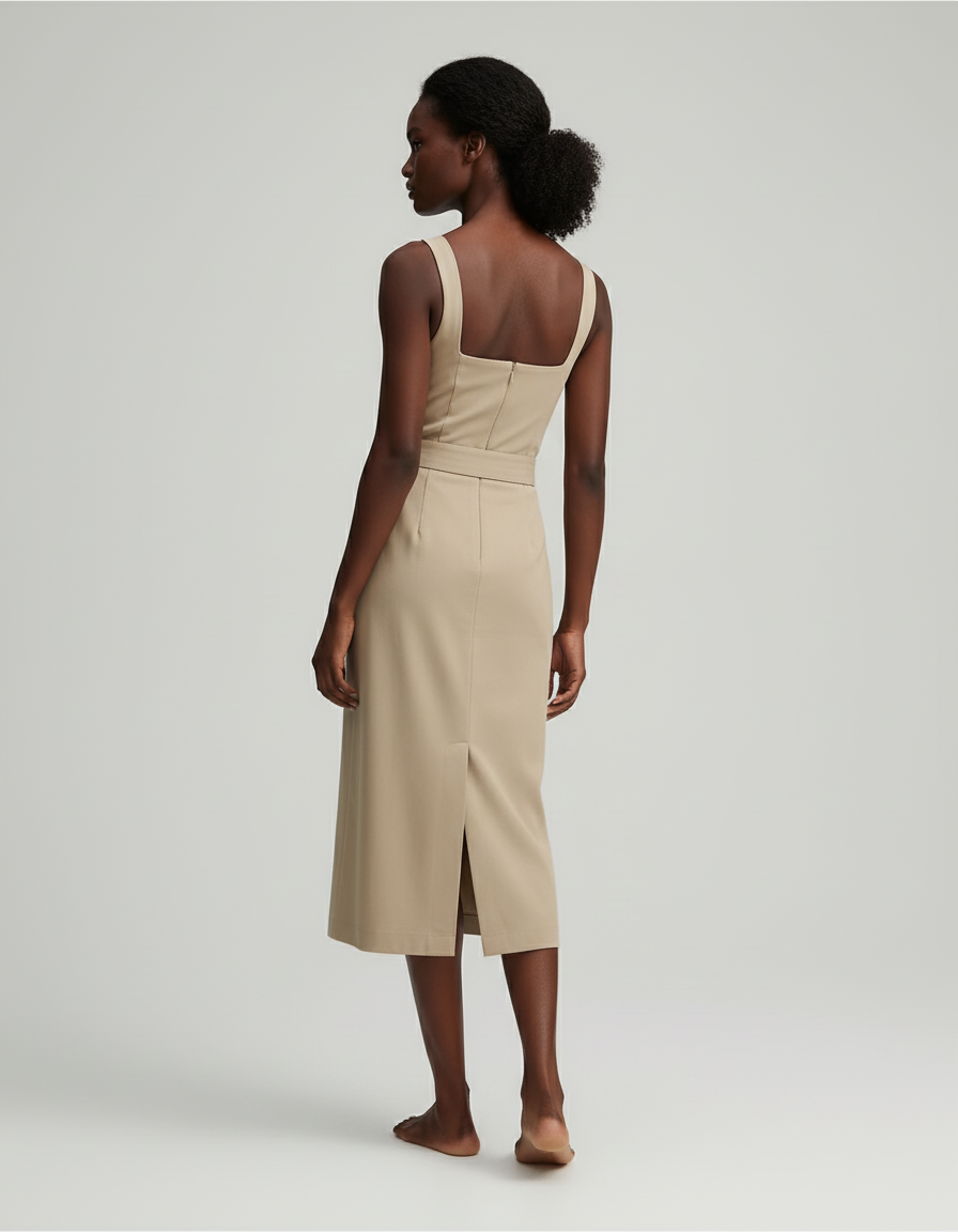 Cette jupe crayon présente une fente frontale et une taille marquée. Elle est associée à un haut sans manches de couleur beige.