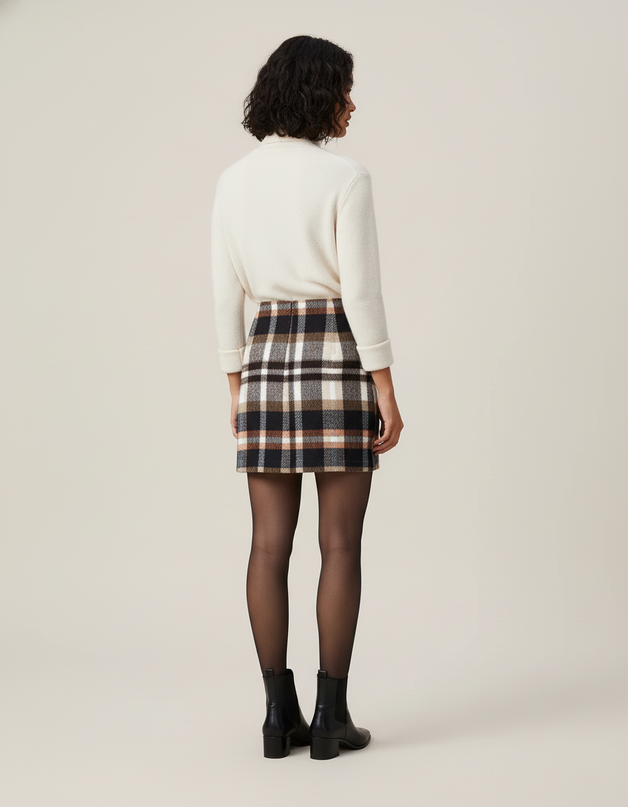 Idéale pour le travail, associez-la à une blouse fluide et des escarpins pour une allure professionnelle affirmée. Pour une transition parfaite vers un dîner ou un événement plus décontracté chic, optez pour un pull fin en cachemire et des bottines élégantes, comme celles portées par notre modèle. Les motifs carreaux, intemporels et raffinés, offrent une grande facilité d'association, faisant de cette jupe une pièce maîtresse versatile qui rehausse instantanément chaque tenue d'une touche de sophistication authentique et moderne.