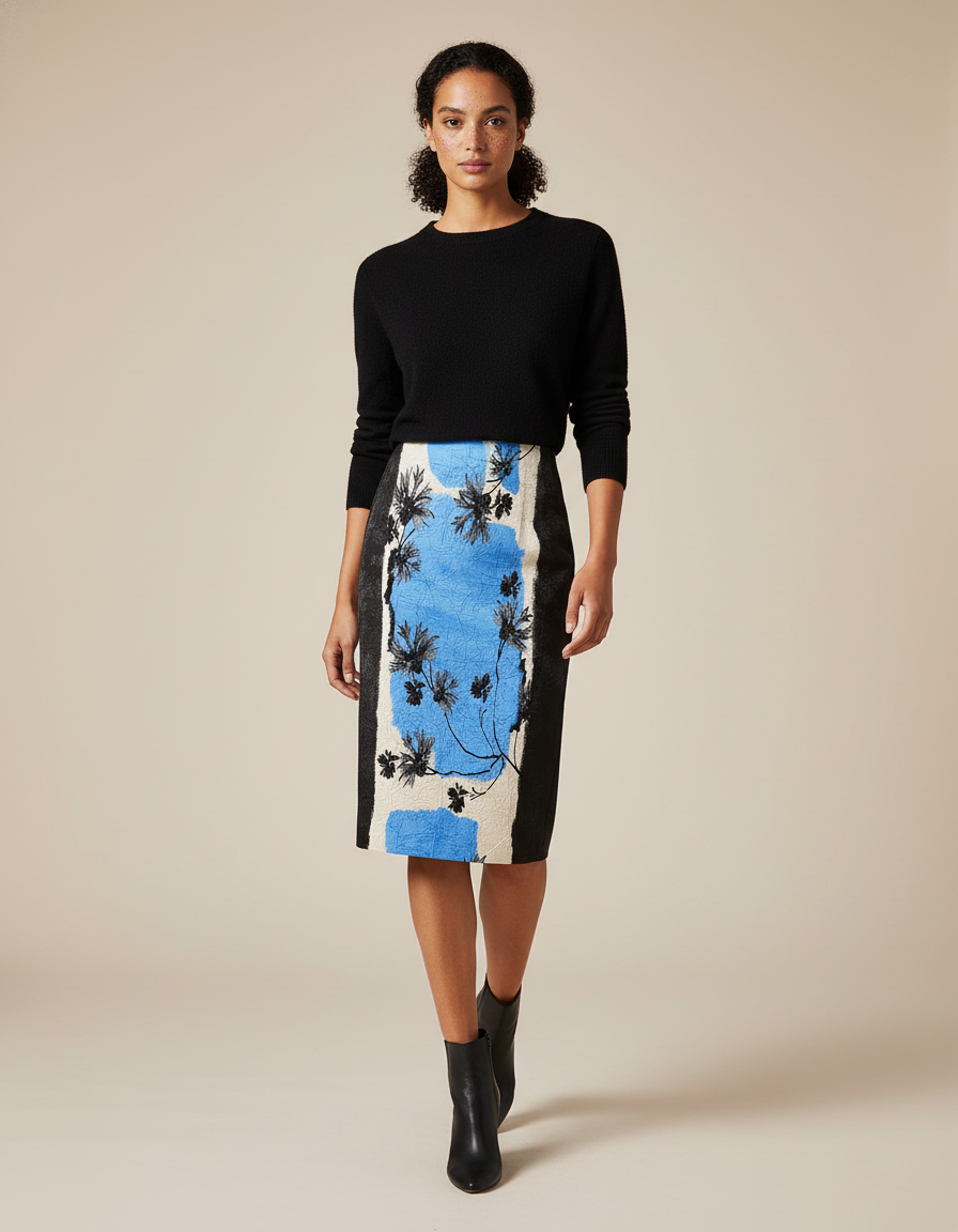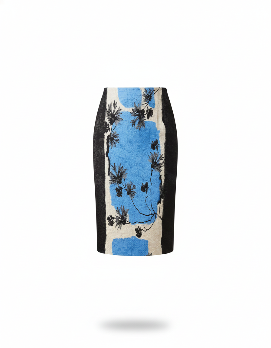 Cette jupe crayon présente un motif floral stylisé avec des sections bleues, noires et un fond clair. Elle s'arrête à mi-mollet.