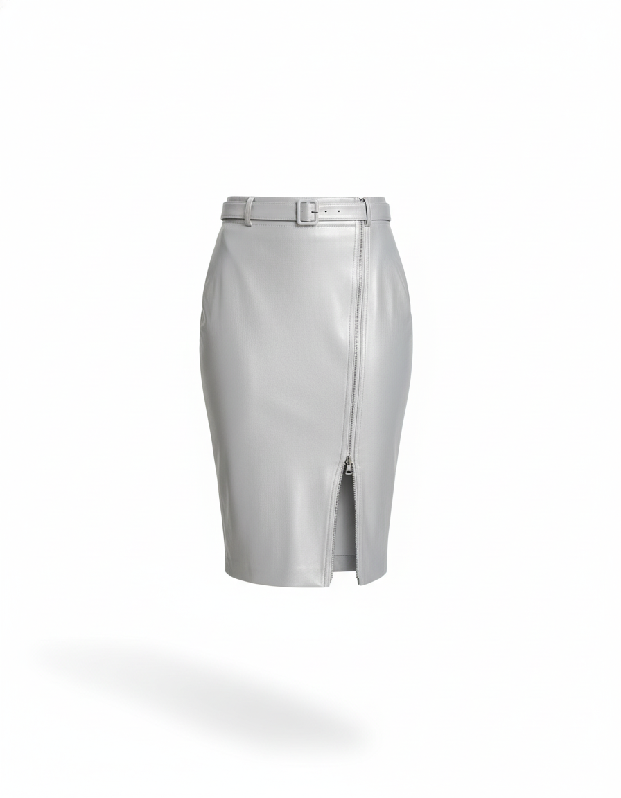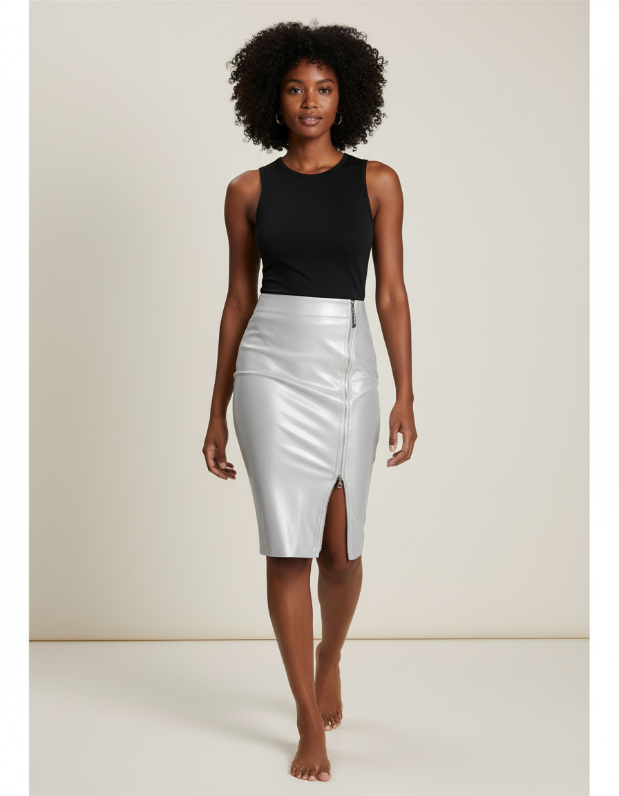 Élégance moderne et audace se rencontrent dans cette jupe crayon argentée en similicuir, parfaite pour un look sophistiqué et tendance.