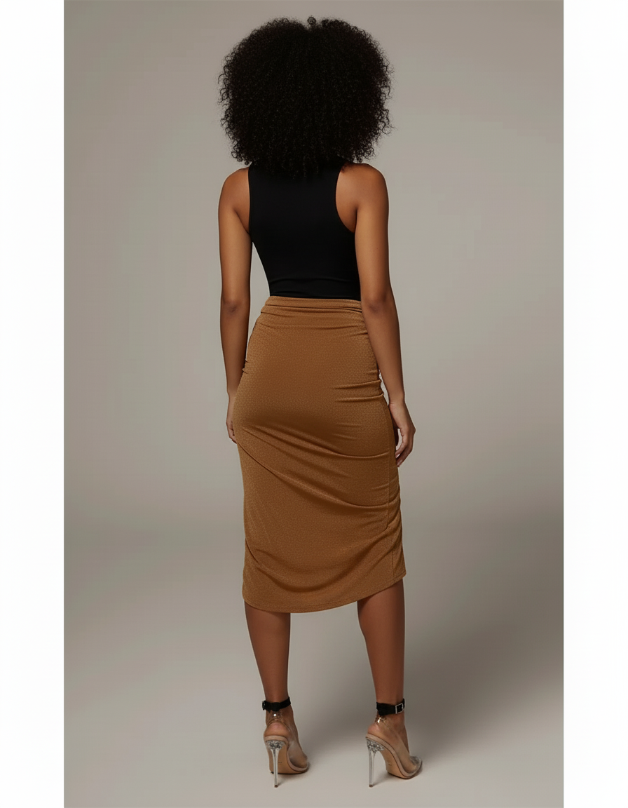 Succombez au charme sophistiqué de notre Jupe Crayon Asymétrique Froncée Chic. Confectionnée dans une maille marron scintillante, cette pièce maîtresse sculpte élégamment la silhouette, offrant un tombé impeccable qui met en valeur chaque mouvement. L'asymétrie audacieuse et les fronces délicates créent un drapé unique, parfait pour une soirée mémorable ou un événement mondain. Associez-la à un body noir ajusté et des talons transparents pour une allure ultra-glamour, ou optez pour une blouse en soie fluide et des sandales fines pour un cocktail chic en journée.