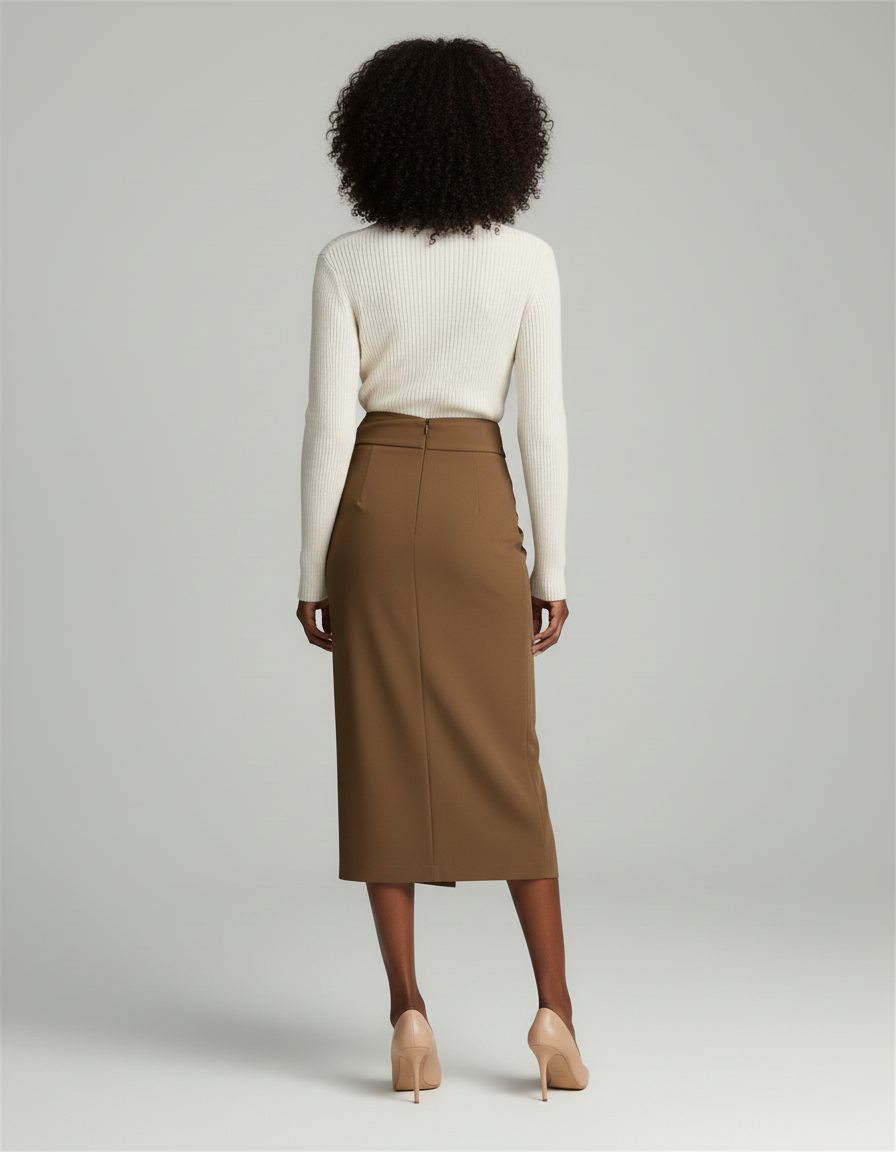 Conçue pour la femme moderne, notre Jupe Crayon Avec Nœud en marron incarne le chic professionnel sans sacrifier le bien-être. Sa coupe impeccable, sublimée par un nœud délicat à la taille, offre une silhouette élégante et structurée. Oubliez les contraintes habituelles des jupes crayons : grâce à notre tissu haut de gamme et à une conception réfléchie, cette jupe assure une liberté de mouvement exceptionnelle. Vous vous sentirez à l'aise et confiante, que vous enchaîniez les réunions ou les déplacements.