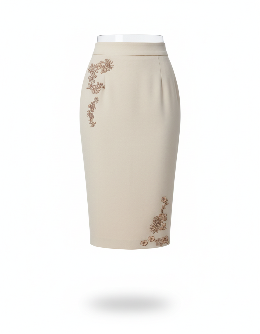 Jupe Crayon Beige Broderie Élégante : L'Essence du Chic Moderne