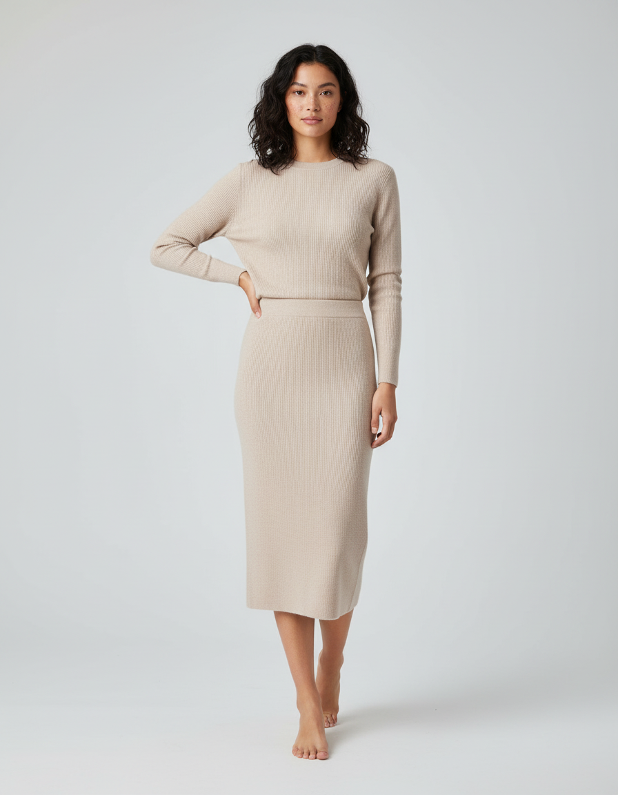 Ce qui distingue notre Jupe Crayon, c'est son tricot côtelé de haute qualité, sélectionné pour sa texture riche et sa tenue impeccable, garantissant un tombé parfait sans jamais se déformer. Sa teinte beige neutre et polyvalente en fait un caméléon de votre garde-robe, s'associant sans effort à vos blazers structurés comme à vos pulls en cachemire les plus délicats. Loin des compromis, elle incarne un luxe discret, une pièce durable qui transcende les saisons et affirme votre style avec une assurance naturelle et une élégance sans faille.