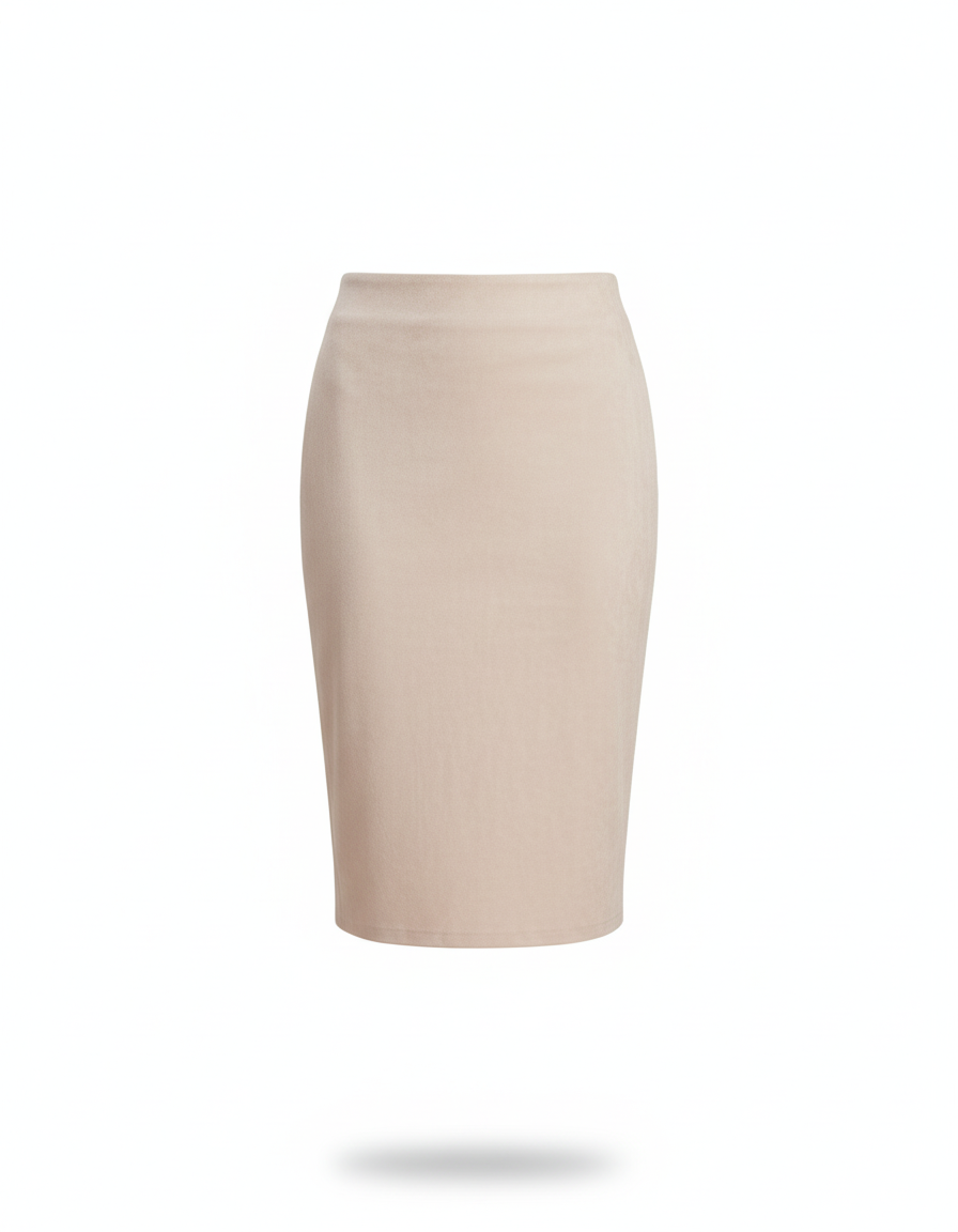 Adoptez une élégance intemporelle avec notre jupe crayon en daim beige, parfaite pour toutes les occasions.