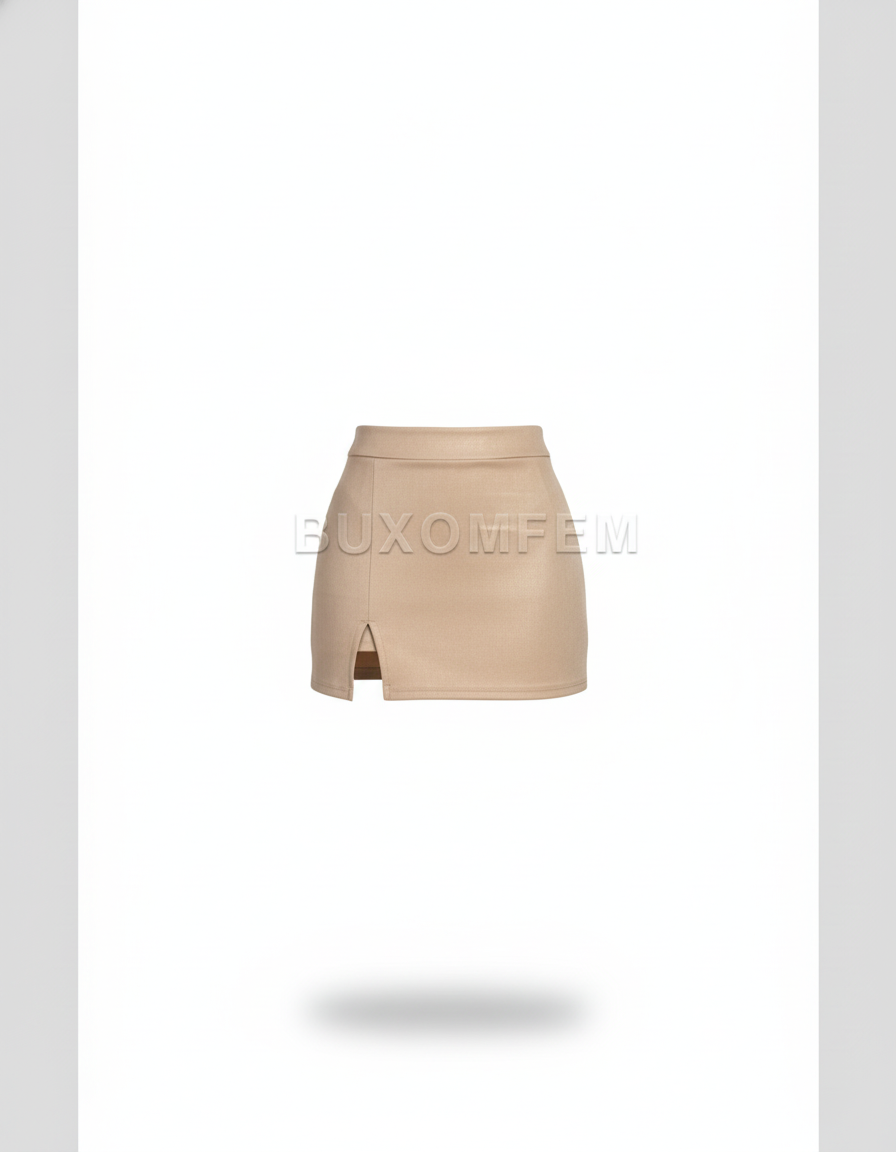 Une jupe courte de couleur beige avec une fente sur le devant. Elle présente une coupe ajustée.
