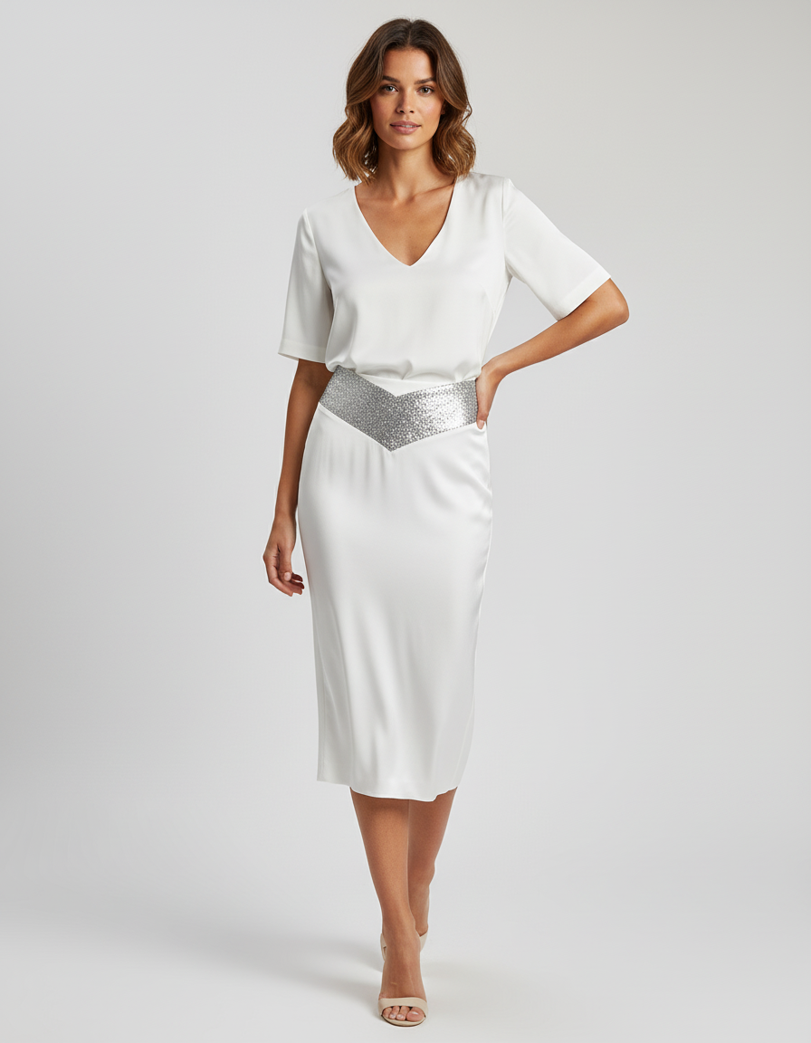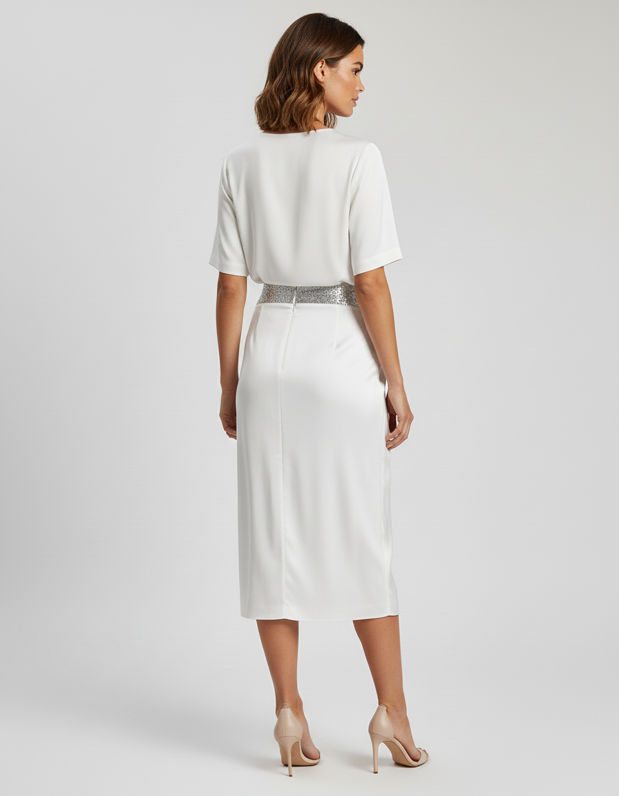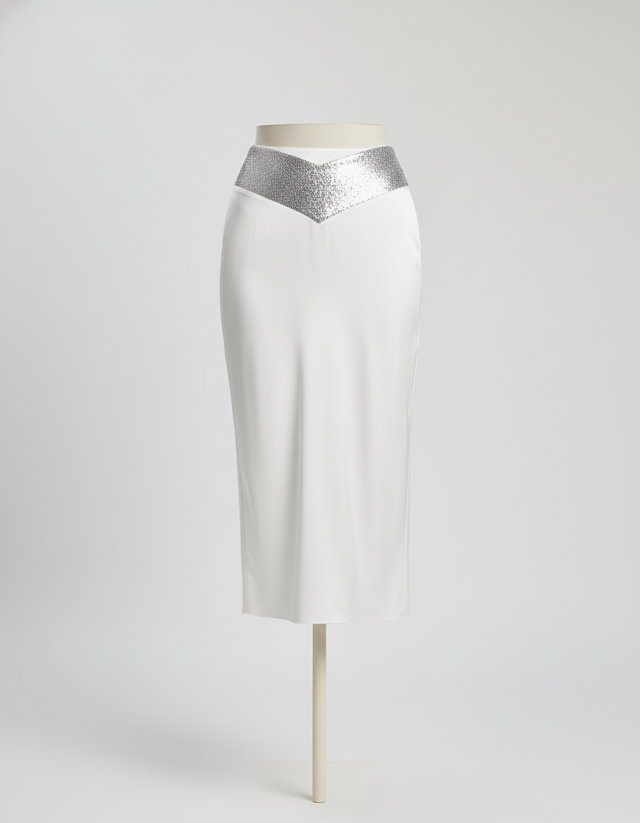 Ce qui la distingue ? Une coupe crayon impeccable en tissu blanc soyeux, épousant délicatement la silhouette, sublimée par une ceinture de paillettes argentées audacieusement agencées en V. Loin des artifices éphémères, cette jupe offre un luxe concret : un équilibre parfait entre le classicisme intemporel et une modernité scintillante. C'est l'investissement parfait pour celles qui recherchent une élégance distinctive et une qualité irréprochable qui perdure bien au-delà des tendances.