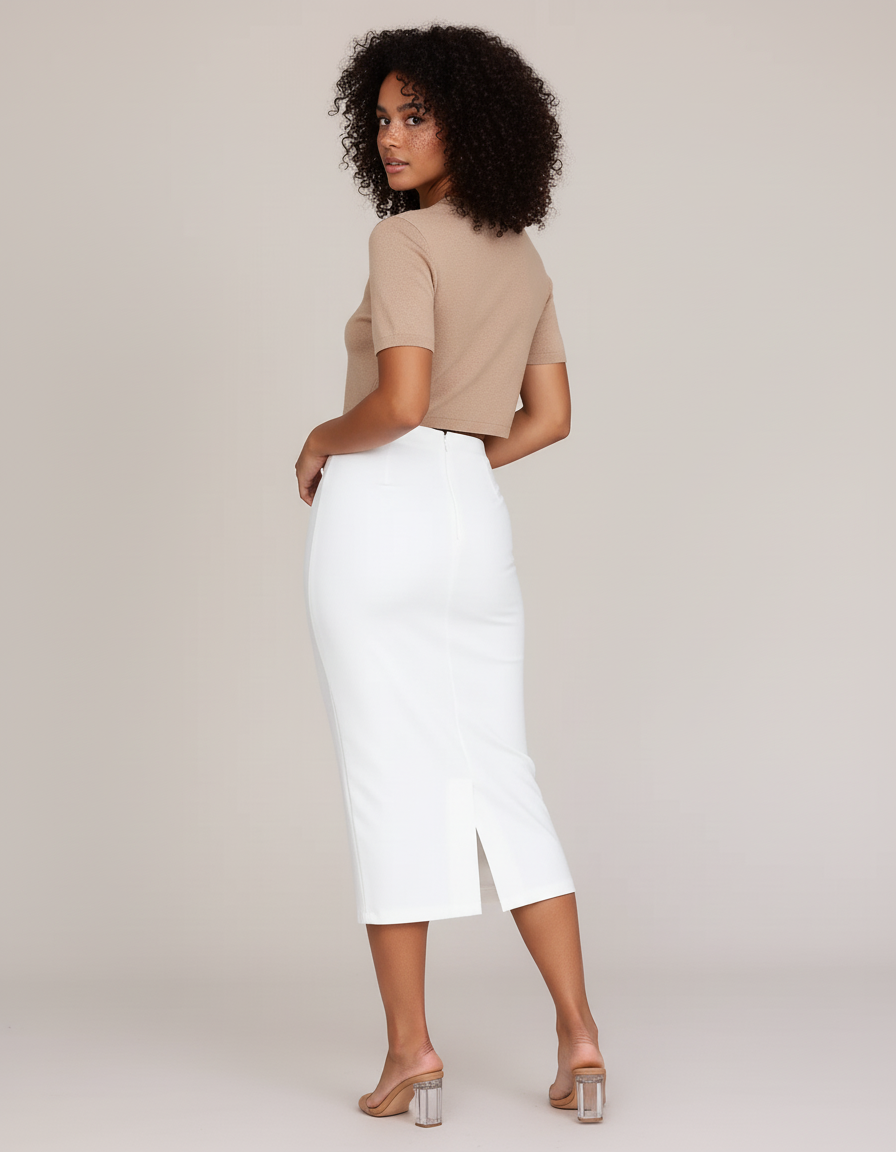 Découvrez notre Jupe Crayon Blanche, une pièce maîtresse conçue pour sublimer votre silhouette avec une élégance minimaliste. Idéale pour une sortie décontractée, associez-la à un crop top en maille et des sandales fines pour un look estival chic et moderne. Pour une allure plus sophistiquée, elle se marie parfaitement avec un chemisier en soie et des talons, transformant votre tenue pour un événement spécial ou une journée au bureau. Sa couleur intemporelle et sa coupe épurée en font un caméléon de style, capable de s'adapter à toutes vos envies.