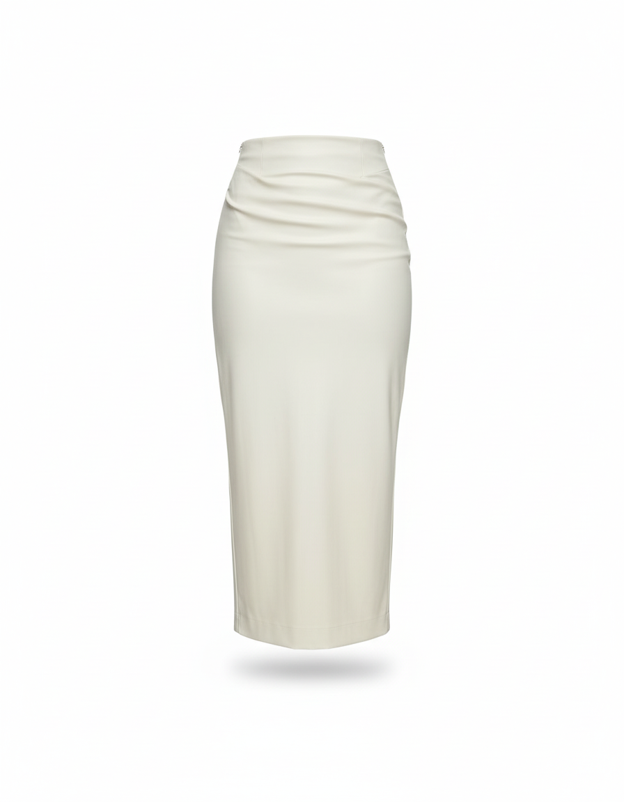 Ce qui distingue notre Jupe Crayon n'est pas seulement sa couleur immaculée, mais la qualité exceptionnelle de son similicuir. Offrant le toucher luxueux du cuir véritable avec une conscience écologique, elle assure une tenue parfaite et un confort durable. Sa coupe crayon emblématique, alliée à des détails subtilement plissés à la taille, crée une silhouette allongée et flatteuse. C'est un investissement dans un style intemporel, une pièce forte qui élève instantanément n'importe quel ensemble, vous positionnant comme une icône de l'élégance contemporaine.