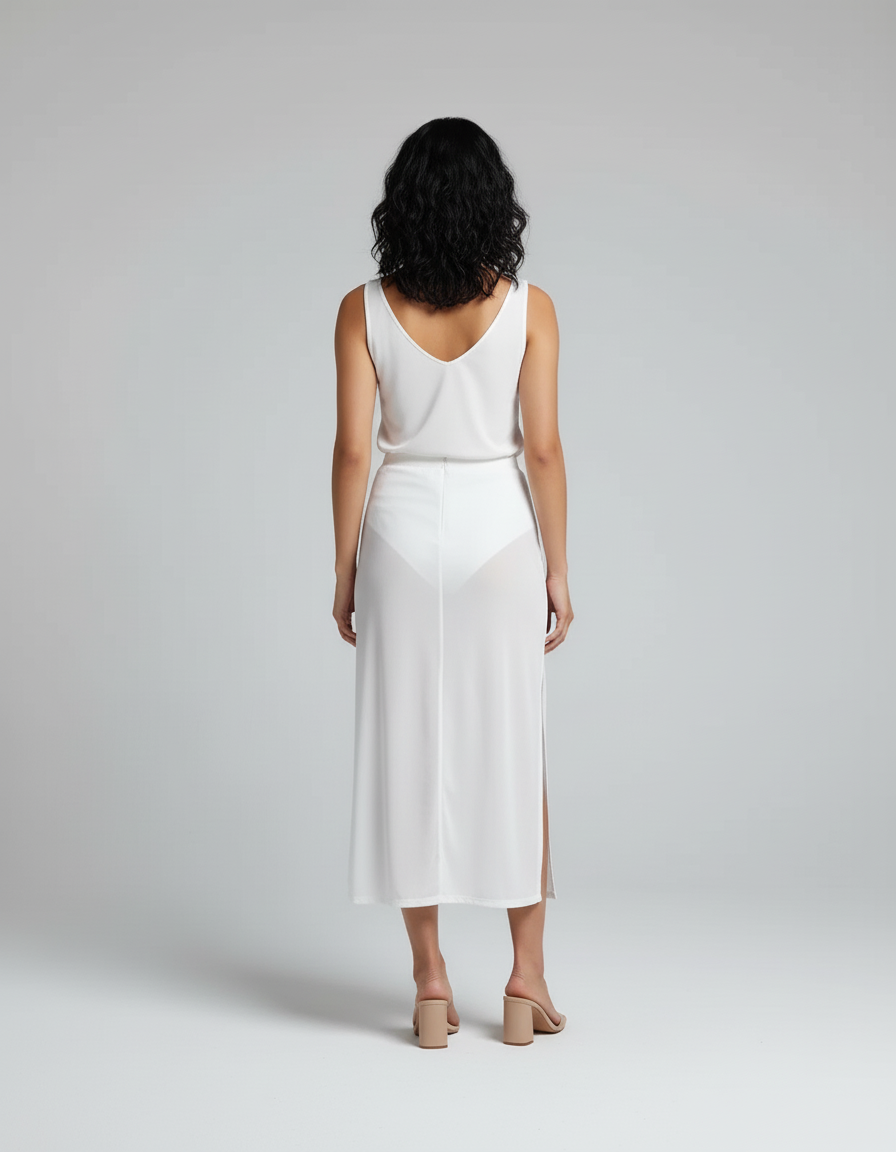 Affirmez votre style avec notre jupe crayon blanche transparente, une pièce chic et moderne.