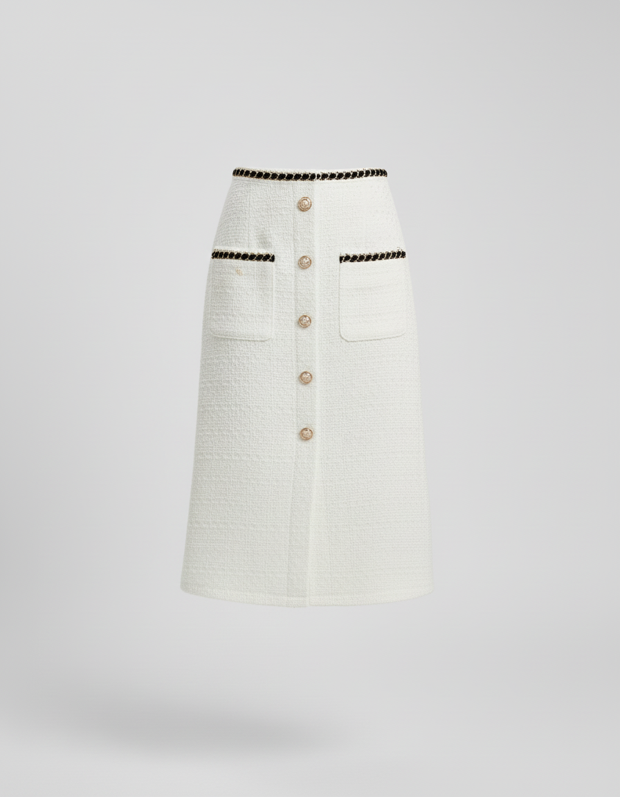 Ce qui la distingue ? Une coupe crayon impeccable qui sublime la silhouette, associée à des détails raffinés : des boutons dorés délicatement alignés et des poches passepoilées rehaussées d'un liseré noir contrastant. Ces finitions pensées avec soin transforment une jupe classique en une déclaration de mode contemporaine. Facile à associer avec un chemisier en soie pour le bureau ou un pull en maille fine pour un look plus décontracté chic, la Jupe Crayon Blanche Tweed Chic est bien plus qu'une jupe : c'est un investissement dans votre garde-robe et votre image.