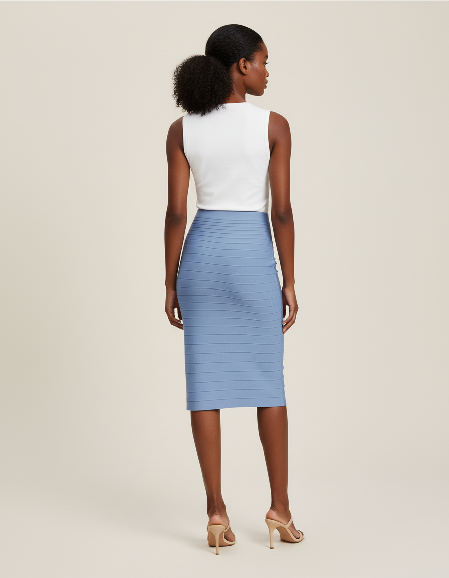 Cette jupe crayon présente une couleur bleu ciel et une texture bandage caractérisée par des bandes horizontales. Sa coupe ajustée s'étend jusqu'à la hauteur du genou.