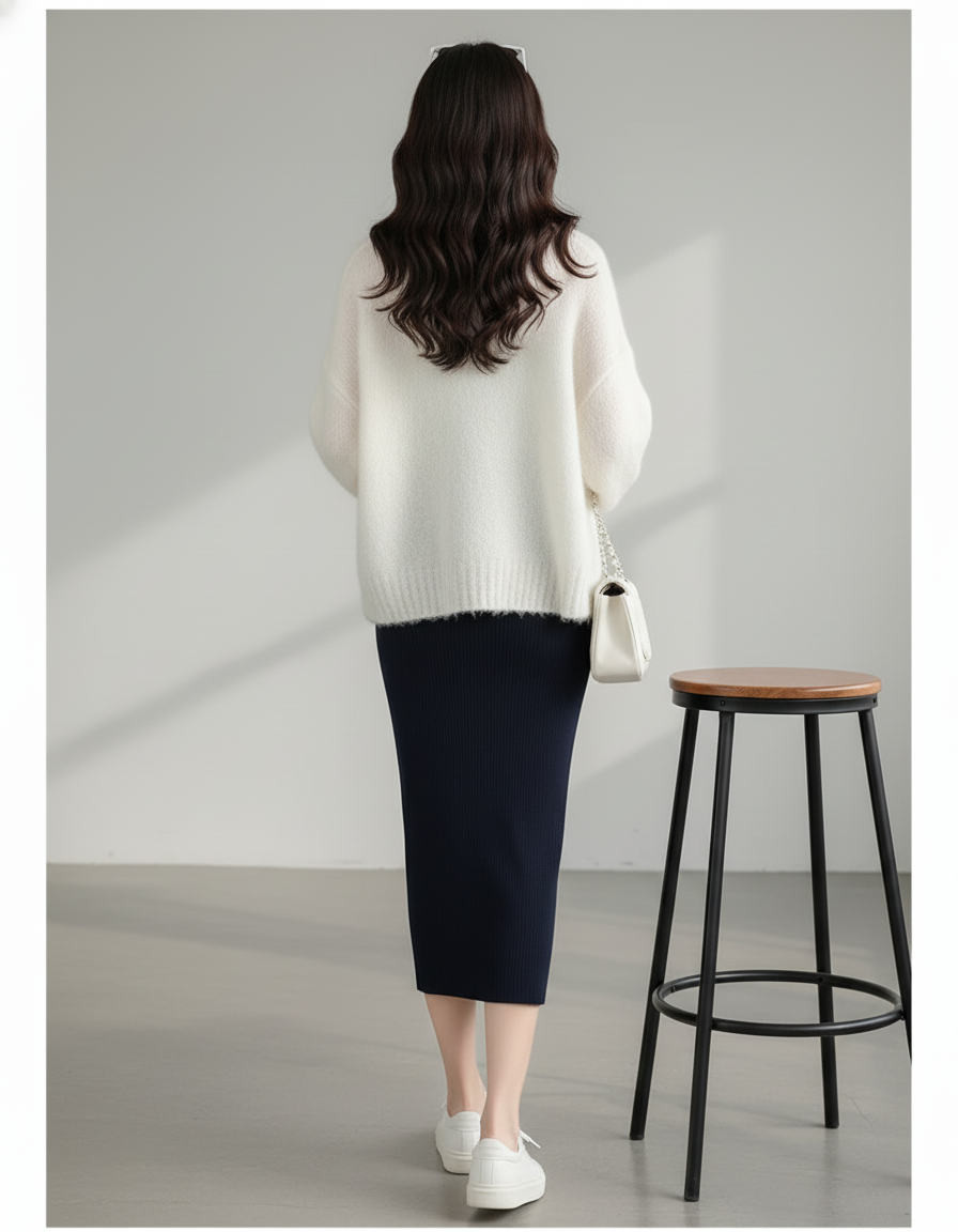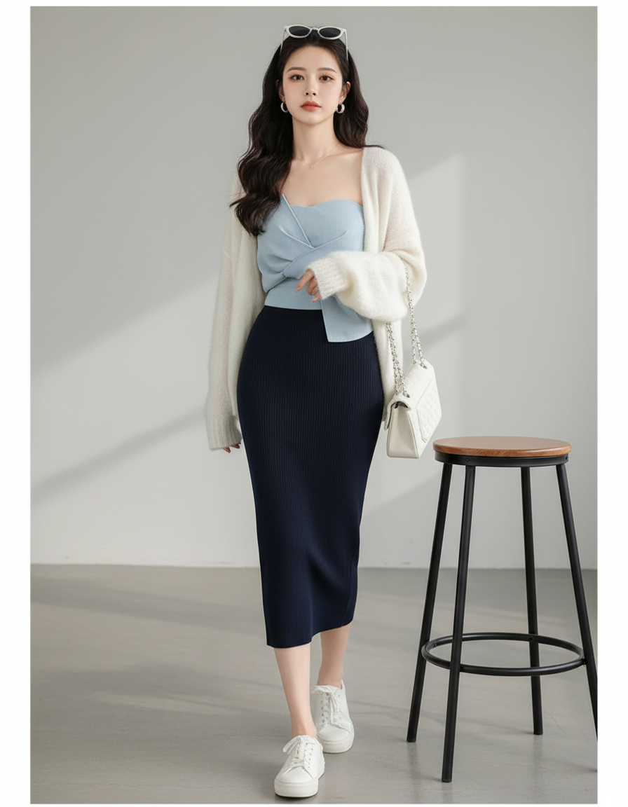 La polyvalence est la signature de notre Jupe Crayon Bleu Marine Côtelée. Pour une allure décontractée et tendance, associez-la à un top fluide et des baskets blanches, comme le modèle. Pour le bureau, transformez-la avec une blouse en soie et des talons raffinés, complétés par un blazer ajusté pour une élégance professionnelle. En soirée, osez un caraco délicat et des accessoires scintillants pour un look sophistiqué qui ne manquera pas de faire sensation. Cette jupe s'adapte à toutes vos envies, du matin au soir.
