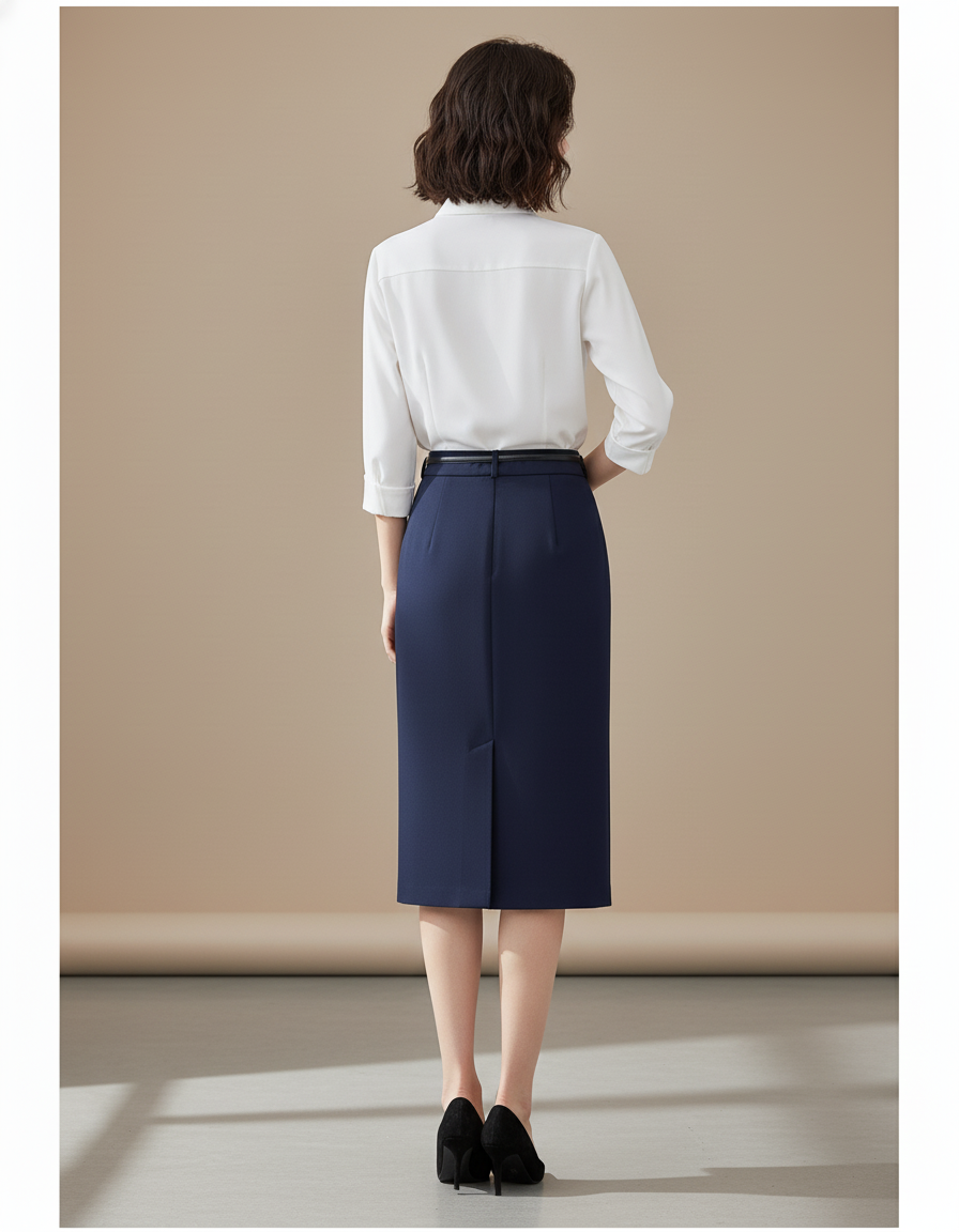 Cette jupe crayon est de couleur bleu marine et présente une fente discrète sur le devant, avec une coupe droite et une longueur midi sous le genou.
