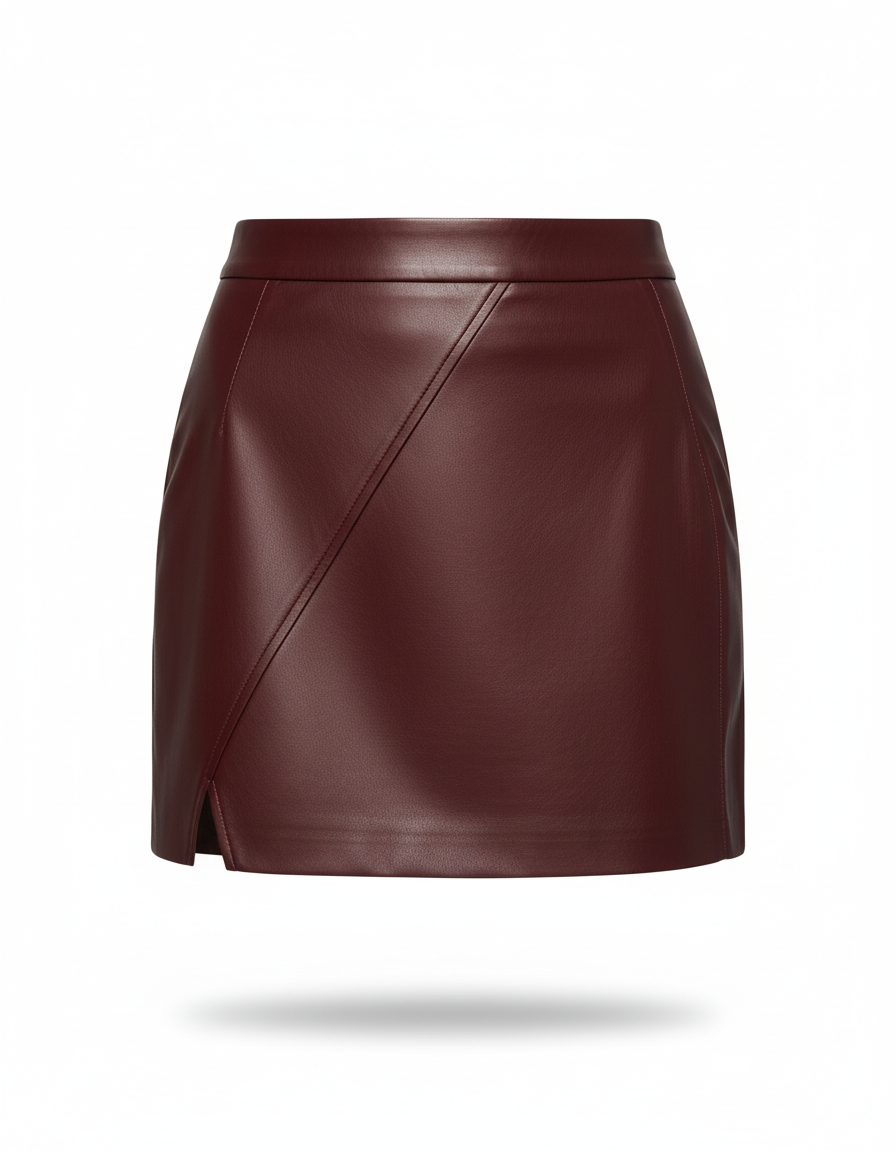 Cette jupe courte en similicuir présente une coupe asymétrique sur le devant et est de couleur bordeaux. Elle dispose d'une petite fente latérale.