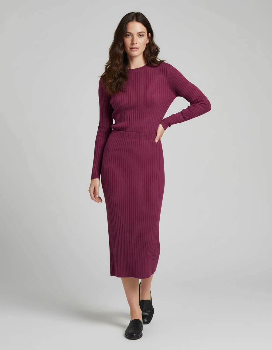 Jupe Crayon Bordeaux Maille Côtelée Élégante