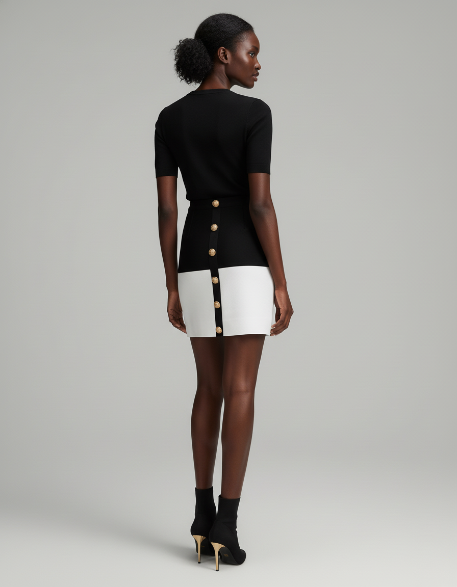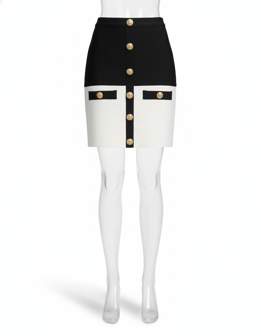 Adoptez un look sophistiqué avec notre jupe crayon bicolore ornée de boutons dorés.