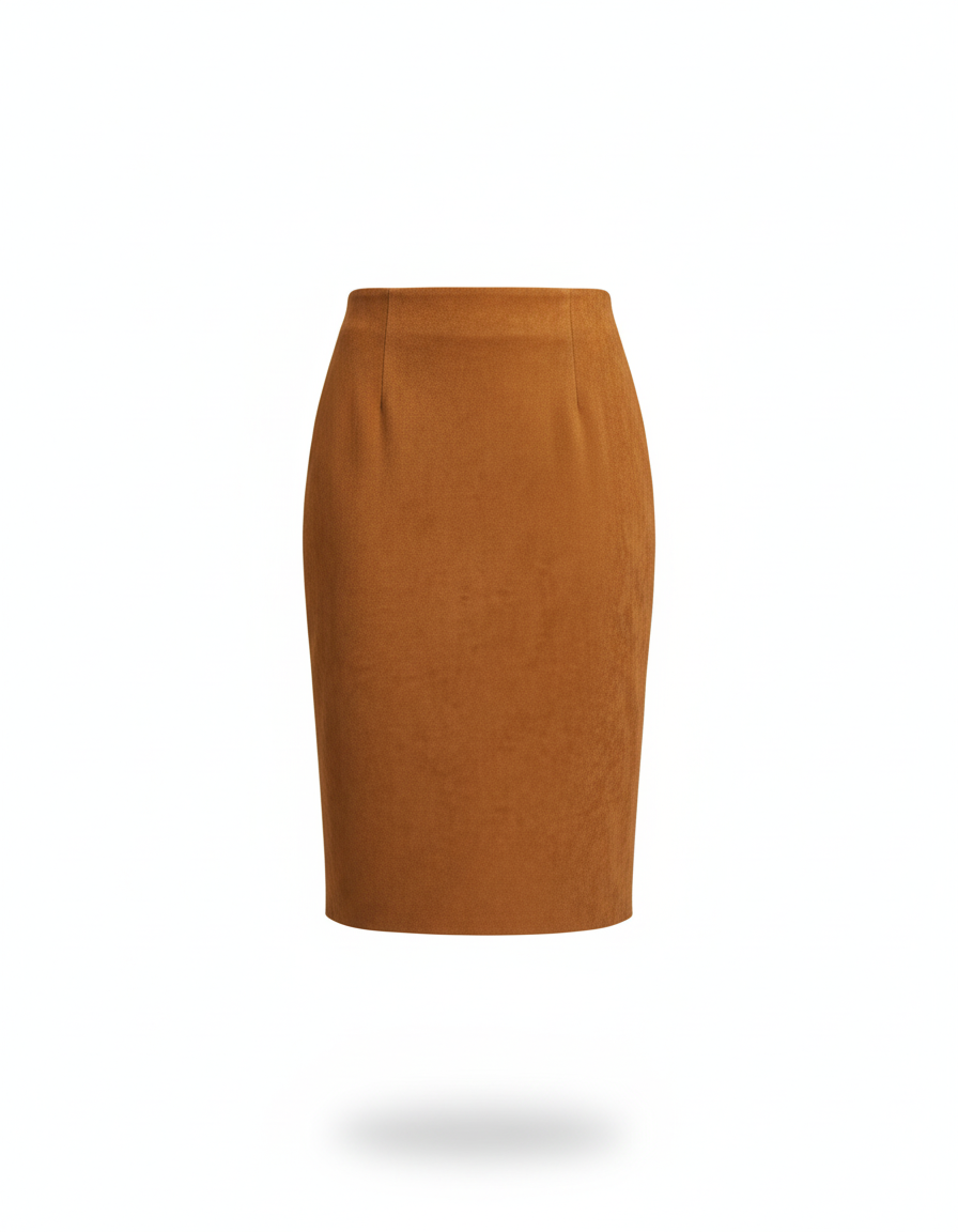 Cette jupe crayon taille haute est de couleur camel. Elle présente une texture unie d'apparence douce, similaire au daim, et sa longueur atteint le genou.