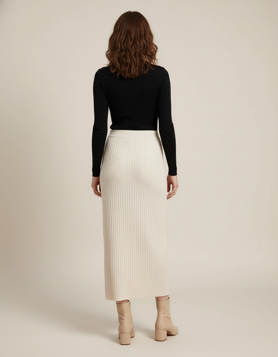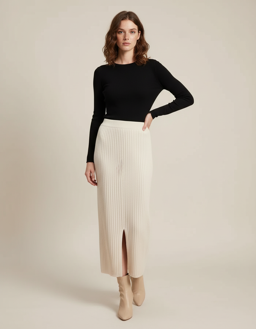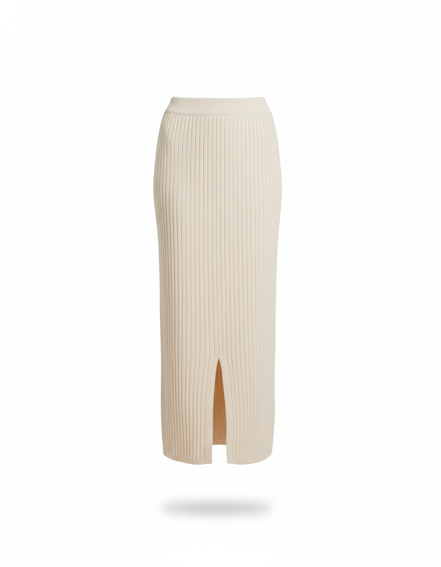 Une jupe crayon en maille côtelée de couleur crème, présentant une fente frontale.