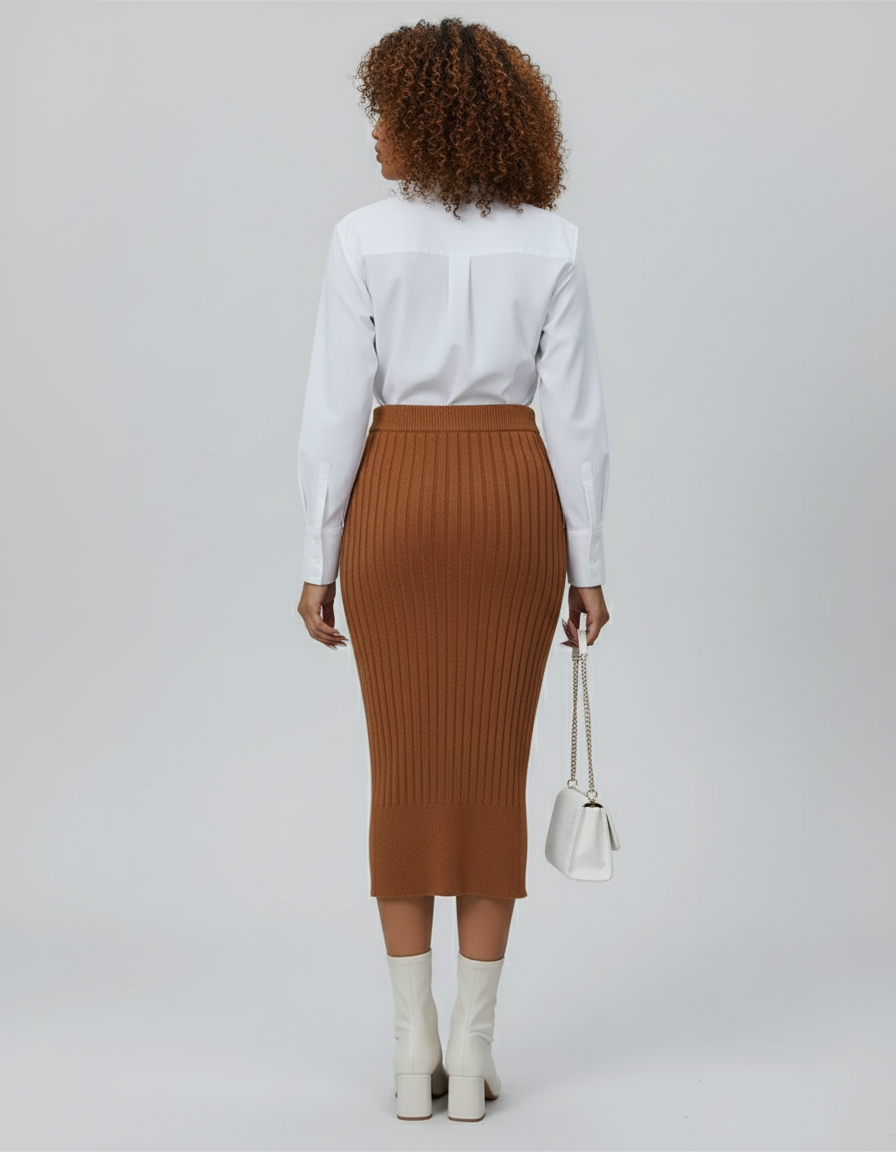 Découvrez la Jupe Crayon Côtelée Fente Élégante, une pièce maîtresse conçue pour la femme moderne qui allie ambition et raffinement. Sa maille côtelée marron épouse délicatement vos formes, dessinant une silhouette élancée et confiante. Idéale pour les journées de bureau exigeantes comme pour les soirées où le chic est de mise, cette jupe est l'incarnation de la polyvalence. Elle vous assure une allure impeccable et une liberté de mouvement, vous permettant de naviguer avec aisance entre vos différents rôles.