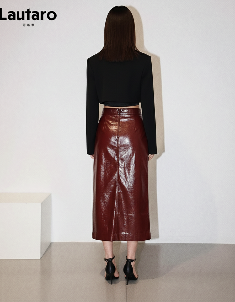 Cette jupe crayon présente une coupe droite et une longueur midi. Elle est confectionnée dans une matière d'aspect cuir bordeaux avec une finition brillante.