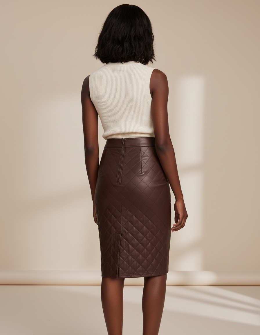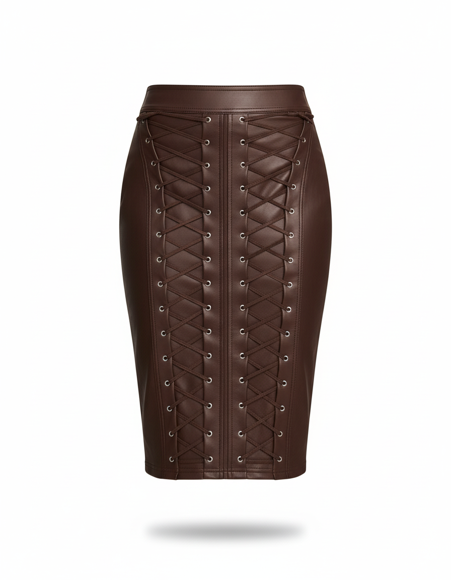 Cette jupe crayon est confectionnée dans un matériau d'aspect cuir marron. Elle présente des détails de laçage vertical sur le devant et une coupe ajustée s'étendant sous le genou.