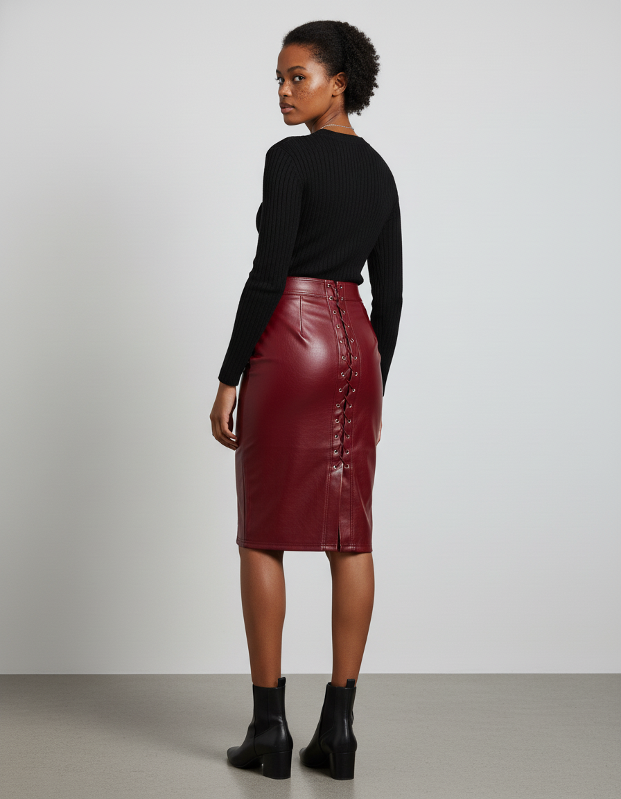 Adoptez un look audacieux et sophistiqué avec notre jupe crayon en cuir rouge à lacets, une pièce maîtresse pour une allure affirmée.