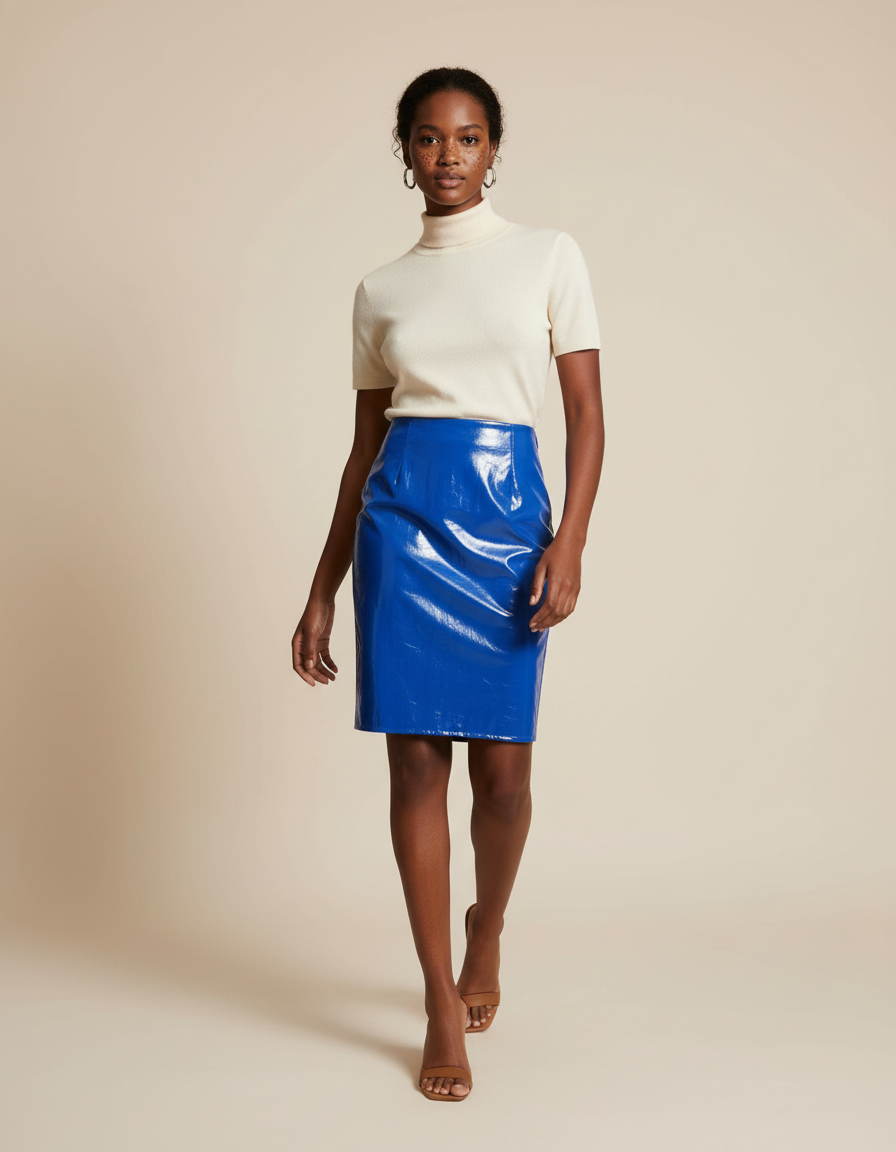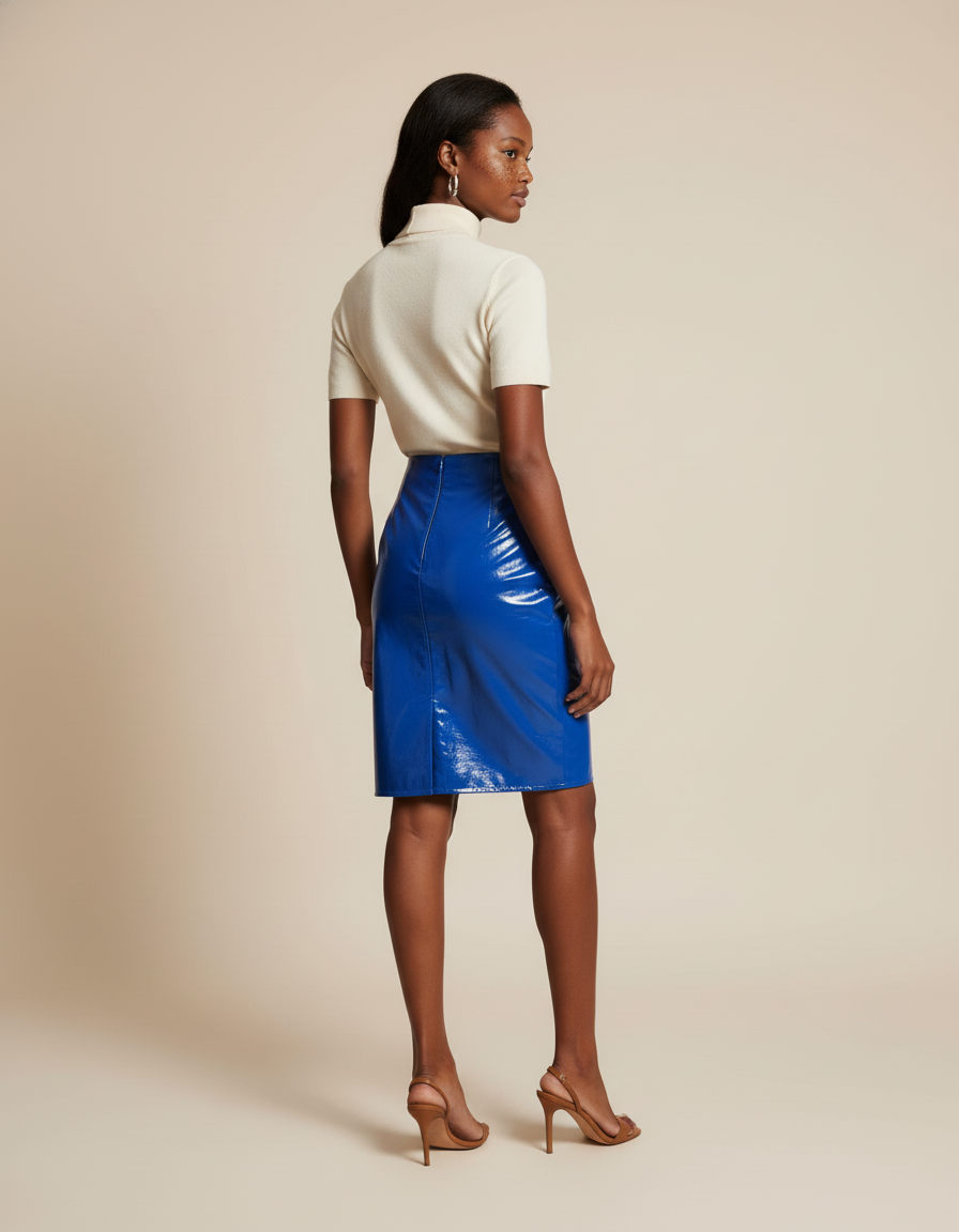 La Jupe Crayon Cuir Verni Bleu Chic : Une Pièce Maîtresse Versatile