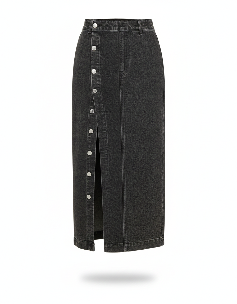 Redéfinissez votre garde-robe professionnelle avec notre Jupe Crayon Denim Délavé Boutonnée Élégante. Son denim gris subtilement délavé et sa rangée de boutons délicats sur le devant apportent une touche de modernité à une coupe intemporelle. Pour un look bureau impeccable, associez-la à une chemise blanche ajustée et des escarpins classiques. En soirée, transformez-la avec un top en soie fluide et des sandales à talons pour une allure sophistiquée. Elle s'adapte aussi parfaitement à un style plus décontracté-chic avec un pull fin et des bottines, prouvant sa polyvalence et son élégance en toutes circonstances.