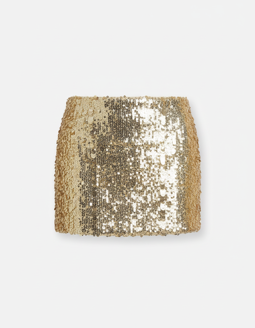Cette jupe est un vêtement à coupe droite entièrement recouvert de sequins dorés. Sa longueur est courte, se terminant bien au-dessus du genou.