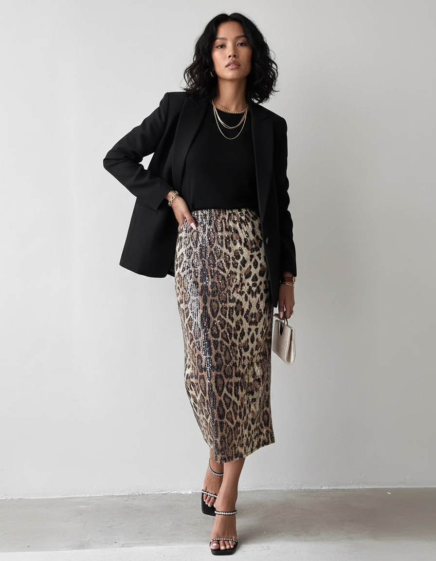 La Jupe Crayon Imprimé Animal est l'incarnation même du glamour audacieux. Confectionnée en sequins scintillants, son motif léopard sophistiqué captive le regard et promet une entrée remarquée. Parfaite pour un cocktail, une soirée ou un événement spécial, elle se marie élégamment avec un top en soie uni et des talons aiguilles pour une allure résolument chic. Pour une approche plus décontractée mais tout aussi stylée, osez l'associer à un blazer noir ajusté et des sandales minimalistes, comme présenté ici, pour un look de jour sophistiqué ou un after-work branché.