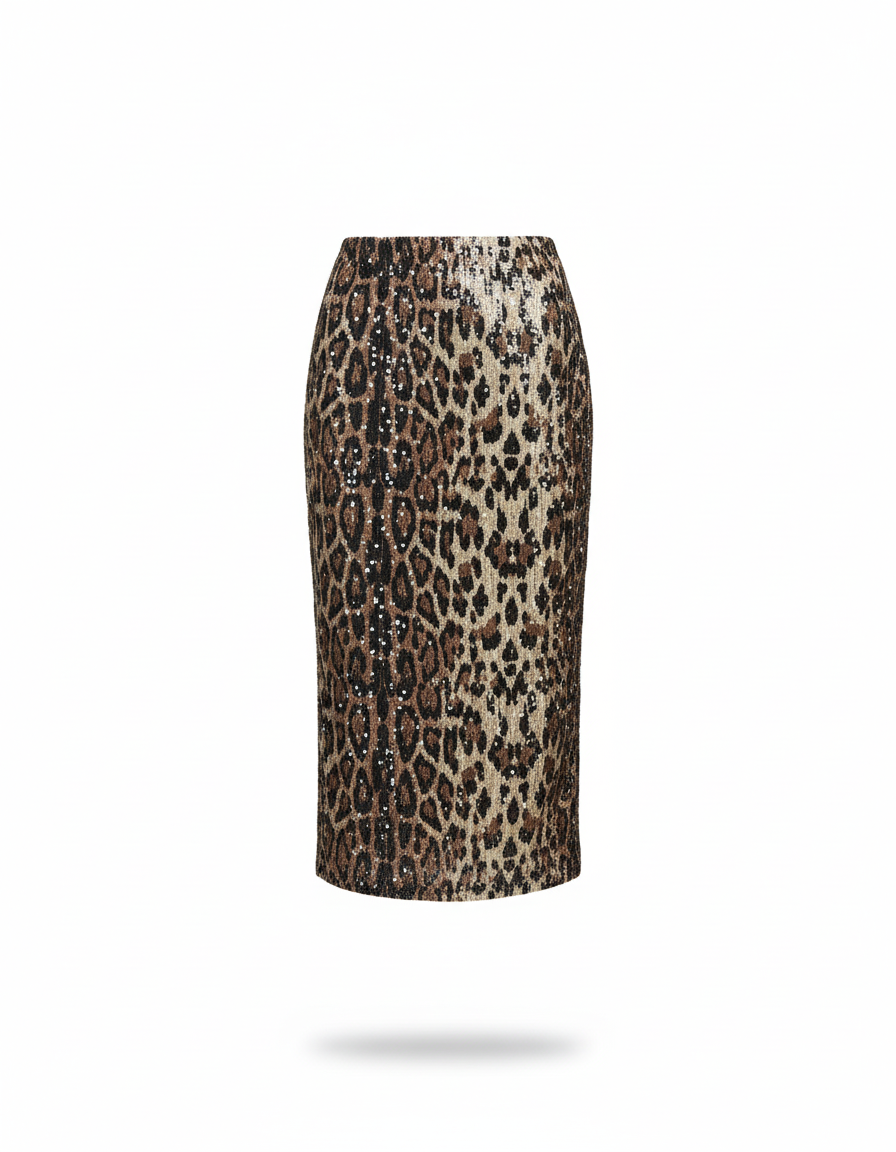 Ce qui distingue notre Jupe Crayon, c'est son imprimé animalier entièrement réalisé en sequins scintillants, offrant une texture riche et un éclat subtil qui danse avec la lumière. Loin des motifs classiques, elle propose une interprétation glamour et luxueuse du léopard, garantissant une pièce unique dans votre garde-robe. Sa coupe crayon impeccable sublime la silhouette, promettant confort et sophistication. Fabriquée avec un souci du détail exemplaire, elle incarne l'essence d'un luxe discret mais affirmé, vous assurant une allure incomparable et un impact visuel des plus saisissants.