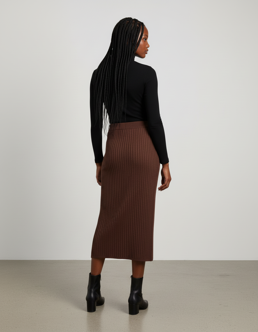 Son coloris marron profond offre une base neutre et chic, facile à coordonner. Que vous soyez en réunion, en déplacement ou simplement en quête d'un confort stylé, cette jupe vous garantit une silhouette élégante et sans effort. Elle est la pièce maîtresse d'une garde-robe minimaliste et consciente, conçue pour durer et vous accompagner avec raffinement dans toutes vos activités.