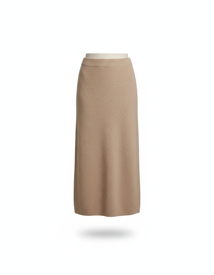 Cette jupe présente une coupe crayon et est confectionnée en laine mérinos. Sa couleur est beige, et elle est tricotée sans coutures.