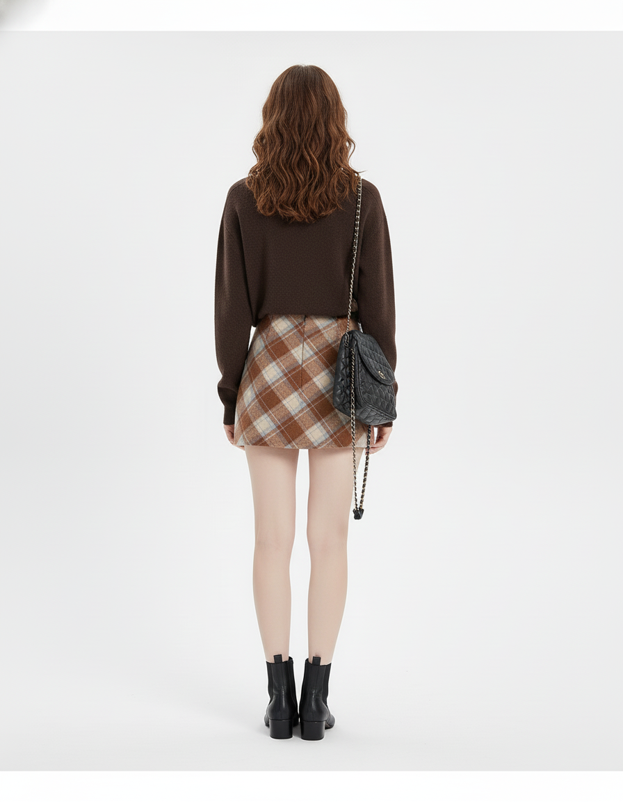 Cette jupe courte présente un motif écossais dans des tons de marron et beige. Sa coupe est droite ou légèrement trapèze, et elle est portée avec une taille haute.