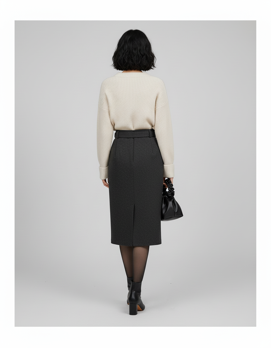 Comme illustré, associée à un pull en maille crème et une ceinture structurée, notre Jupe Crayon Laine Fendue Chic en gris anthracite sculpte une silhouette raffinée et professionnelle. Confectionnée dans une laine premium, sa coupe impeccable et sa fente discrète garantissent une liberté de mouvement absolue, essentielle pour vos journées actives. Elle épouse délicatement vos formes, offrant un confort inégalé sans jamais entraver votre pas.