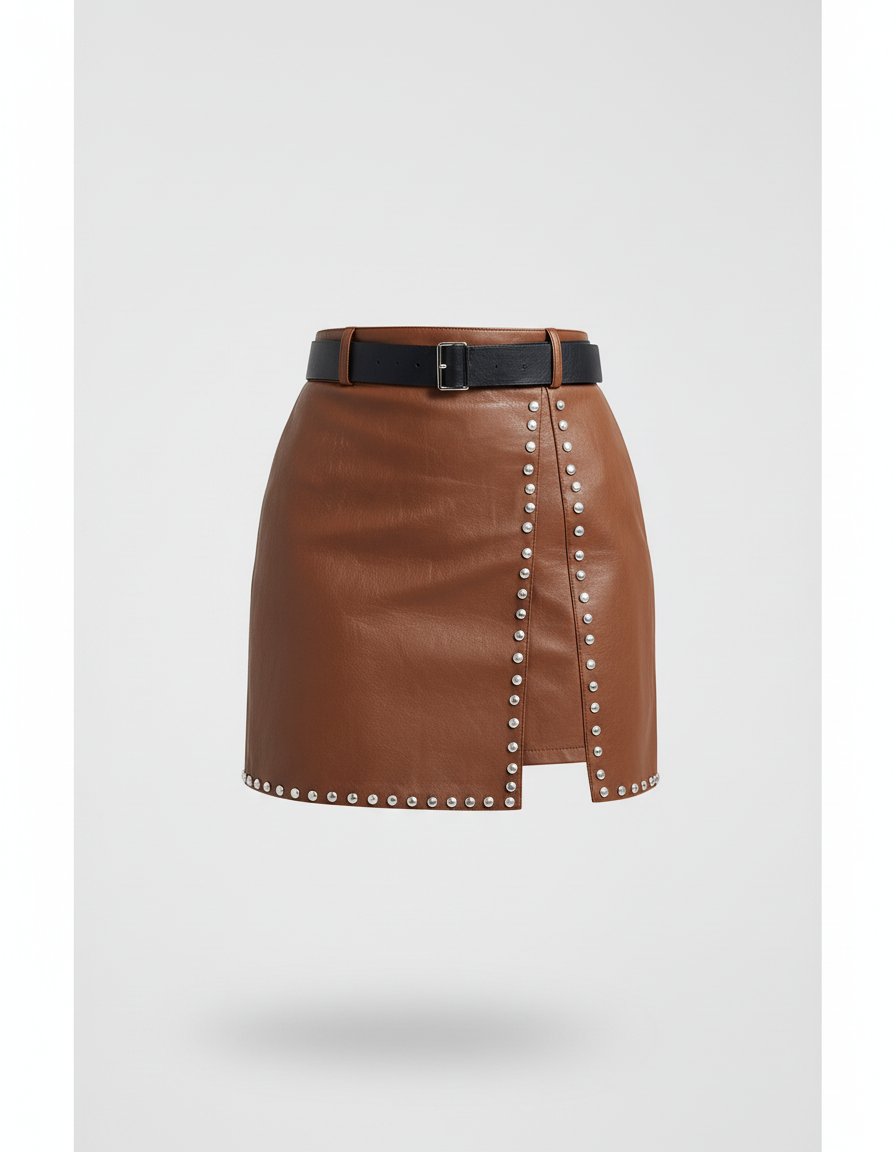 Adoptez un look audacieux et tendance avec cette jupe marron cloutée.