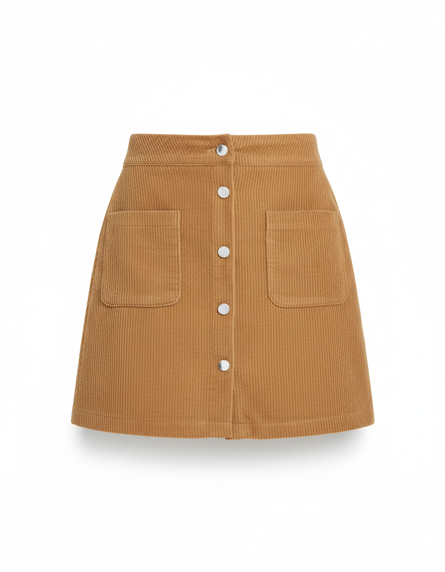 Cette jupe courte est confectionnée en tissu côtelé marron. Elle présente une taille haute et une fermeture boutonnée sur le devant avec deux poches plaquées.
