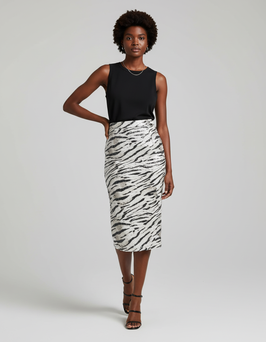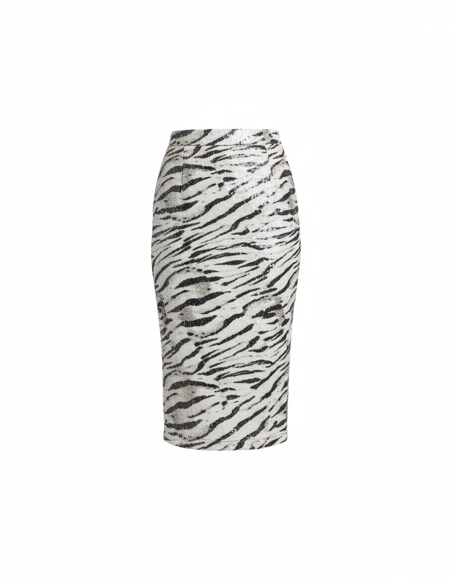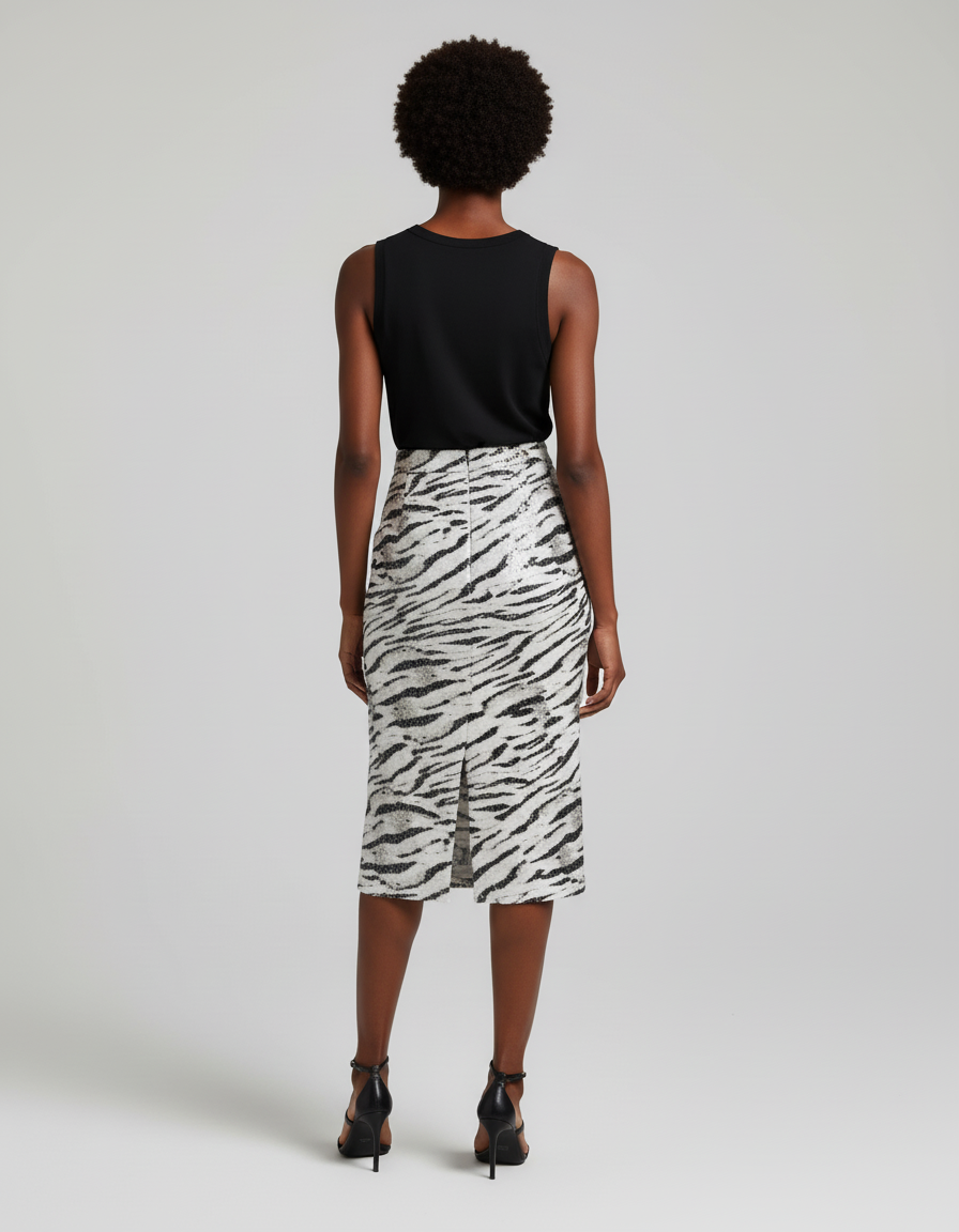 Ce qui distingue cette jupe, c'est l'alliance parfaite entre le confort d'une coupe crayon classique et l'éclat hypnotisant de ses sequins. Chaque mouvement révèle un subtil jeu de lumière, faisant de vous le centre d'attention sans effort. Oubliez les compromis entre élégance et originalité ; notre Jupe Crayon Motif Zèbre Midi Chic est l'incarnation du luxe moderne et de la personnalité affirmée. Portez-la avec un top simple pour un contraste chic ou avec des pièces plus élaborées pour une extravagance assumée. C'est la pièce essentielle pour la femme qui sait ce qu'elle veut et qui n'a pas peur de l'afficher.