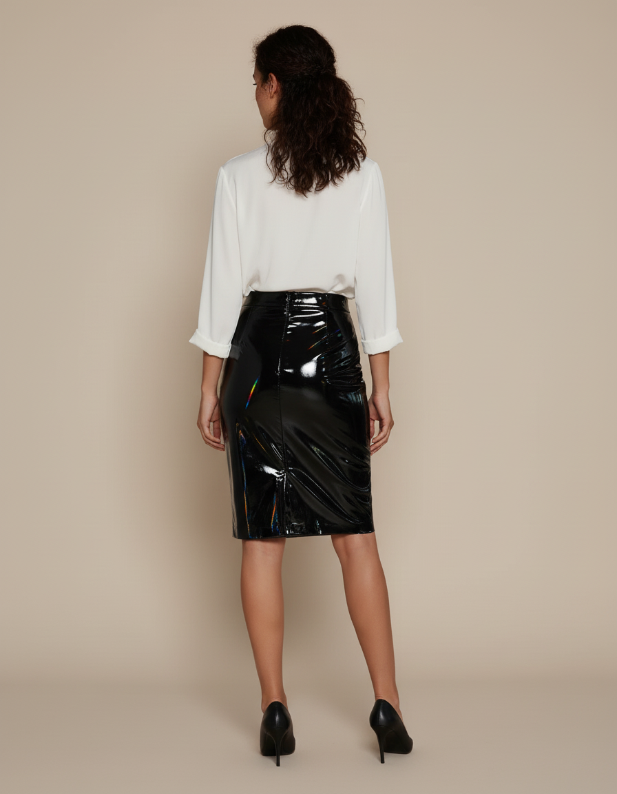 Cette jupe crayon est de couleur noire avec une finition brillante. Elle présente des reflets holographiques sur sa surface.