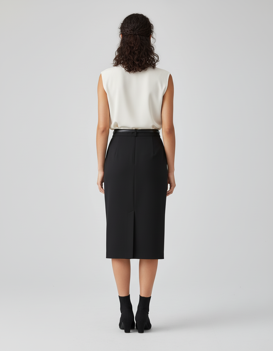 Cette jupe crayon noire fendue est un essentiel intemporel pour toute garde-robe professionnelle ou décontractée chic.