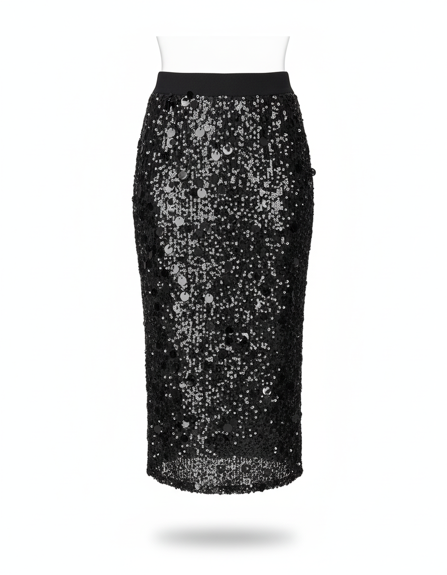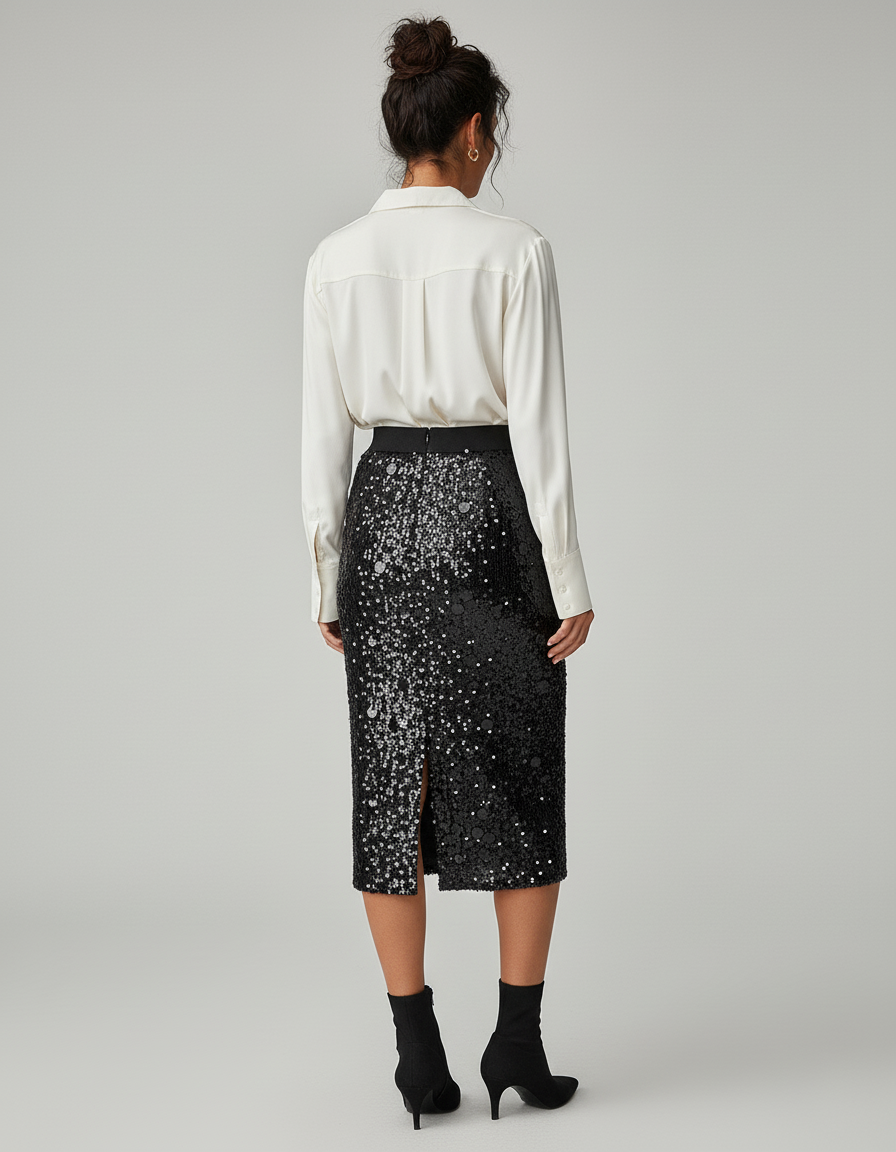 Ce qui distingue notre jupe, c'est l'harmonie parfaite entre l'opulence des paillettes noires et la coupe crayon intemporelle. Chaque sequin est méticuleusement appliqué pour créer un scintillement subtil mais envoûtant, évitant toute surcharge visuelle. Sa taille élastiquée assure un ajustement impeccable et un confort durable, tandis que sa longueur midi offre une élégance discrète. Associez-la à une blouse en soie pour un look raffiné comme sur la photo, ou à un pull en maille fine pour un contraste audacieux et contemporain. C'est la pièce maîtresse qui transforme chaque sortie en une déclaration de style.