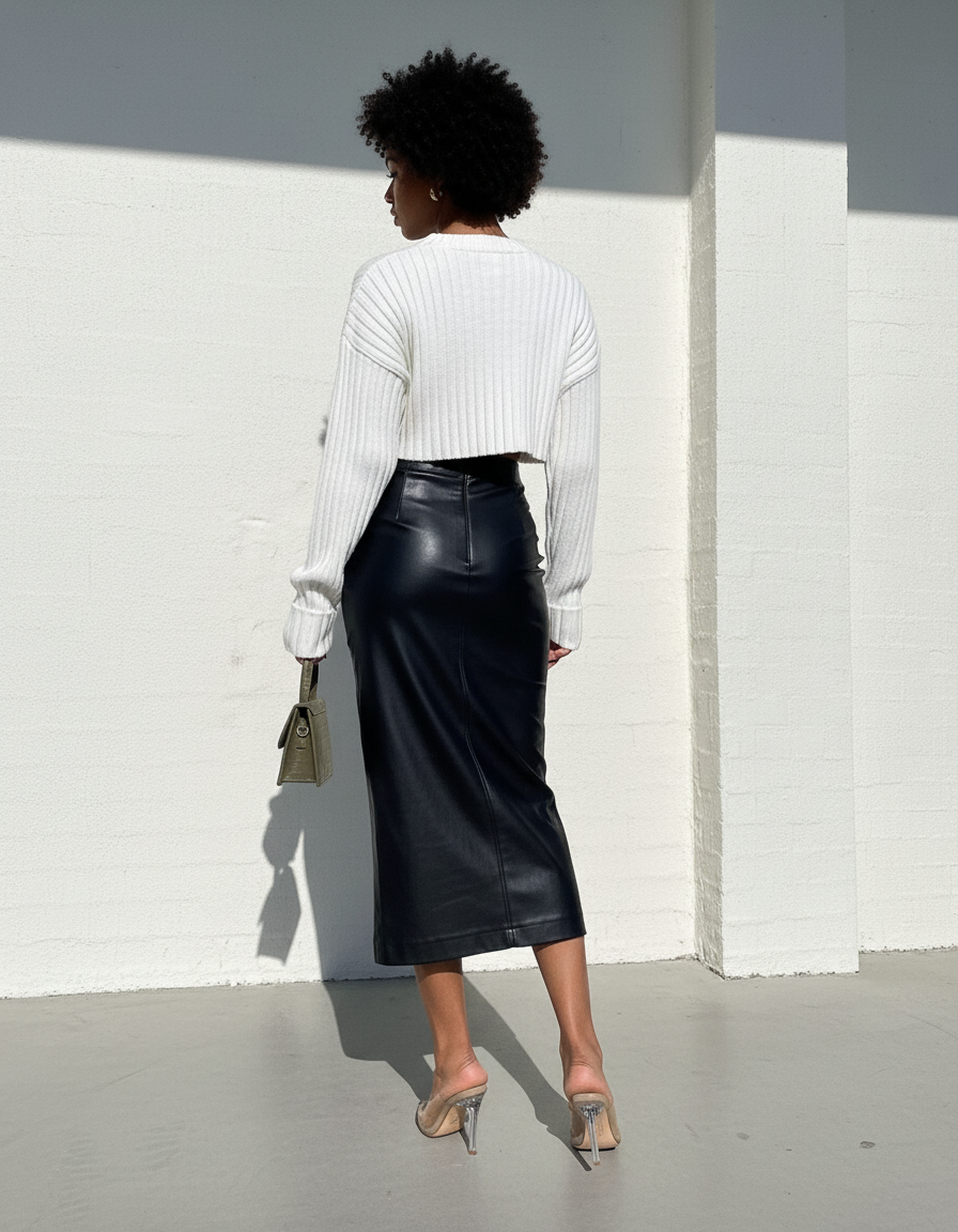 Incarnez l'élégance moderne avec notre Jupe Crayon Noire Similicuir Chic. Son allure sophistiquée en fait la pièce maîtresse idéale pour vos soirées cocktail, où elle captivera tous les regards associée à un crop top en maille fine et des talons transparents pour une touche audacieuse. Mais ne vous y trompez pas, sa polyvalence est infinie : imaginez-la avec un chemisier en soie et des escarpins pour une réunion professionnelle impactante, ou décontractée avec un pull oversize et des bottines pour un brunch élégant. Ce simili-cuir de haute qualité offre un rendu visuel impeccable, reflétant un luxe discret et intemporel.