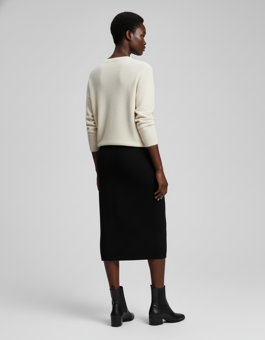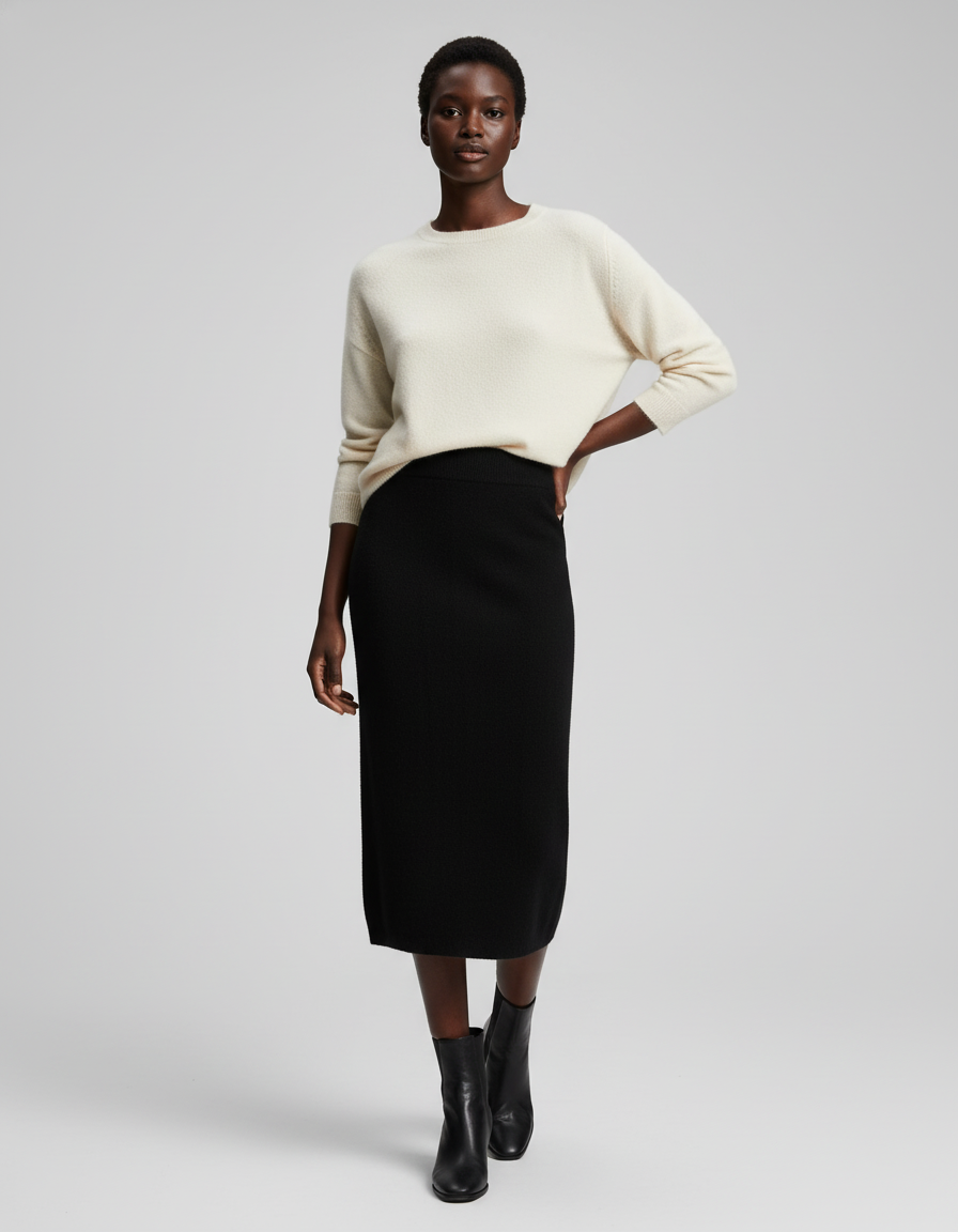 Découvrez notre jupe crayon noire tricotée, une pièce essentielle pour un style à la fois chic et confortable.