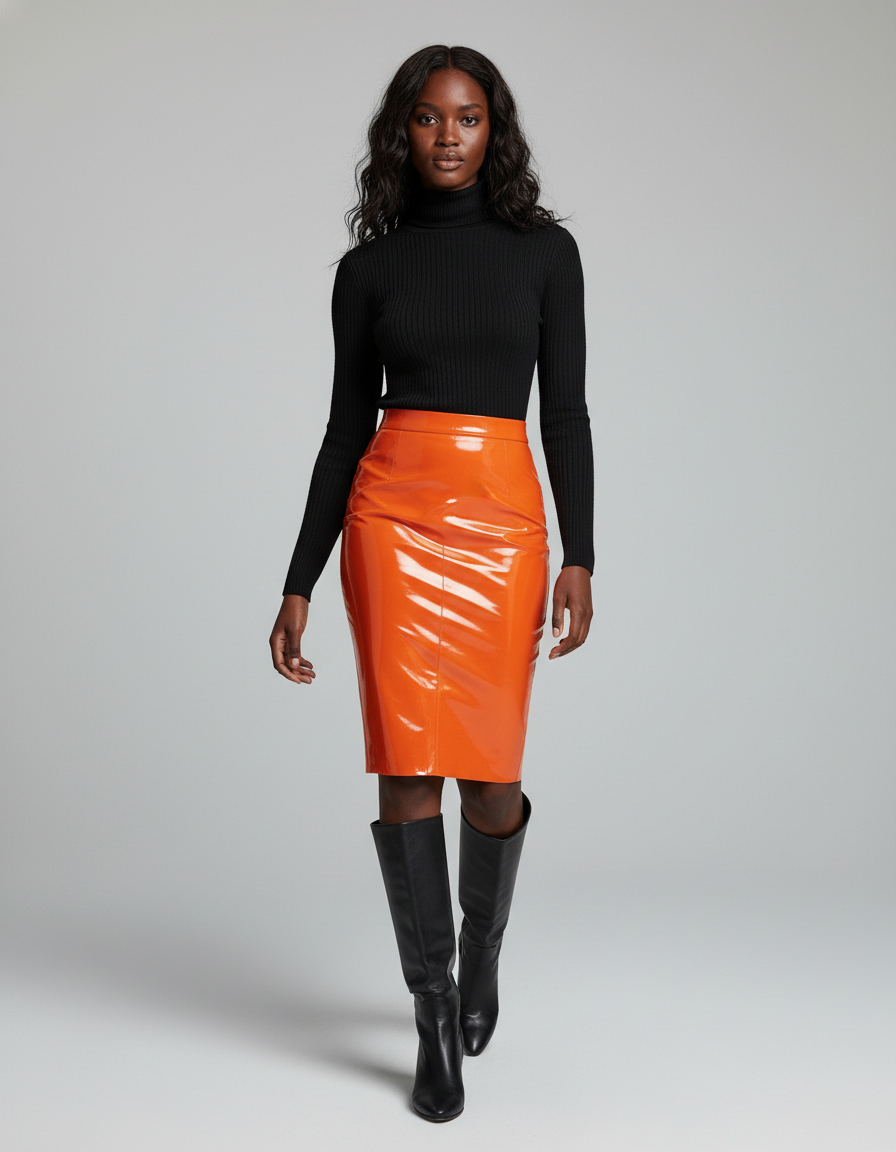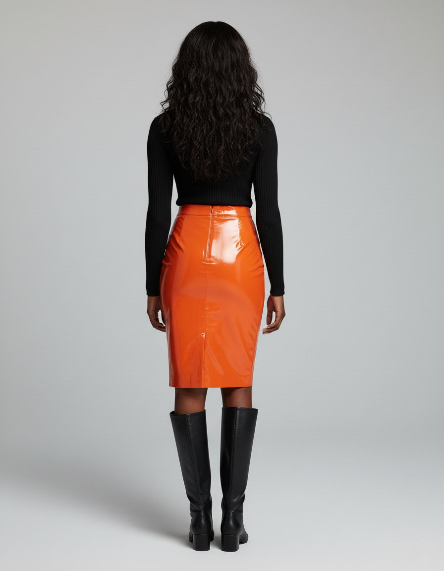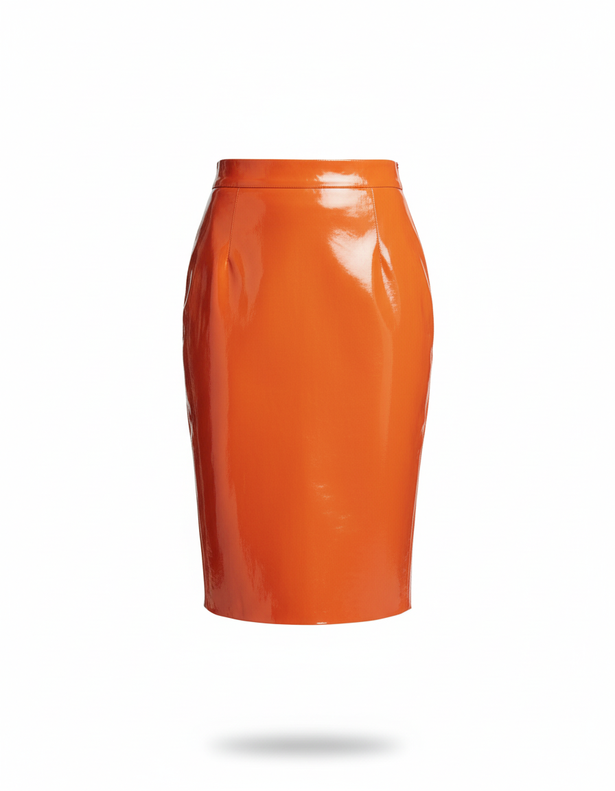 Confectionnée dans un cuir verni d'une qualité exceptionnelle, sa teinte orange vibrante et sa finition brillante capturent la lumière et tous les regards. Loin des classiques, son design épuré et sa coupe crayon intemporelle sont transcendés par cette matière audacieuse, offrant un contraste parfait entre structure et éclat. C'est l'incarnation du luxe moderne, une pièce unique qui défie les conventions et vous distingue avec une élégance saisissante.