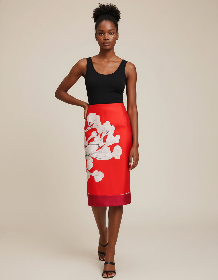Découvrez la Jupe Crayon Originale, une pièce audacieuse et raffinée qui réinvente l'élégance moderne. Sa teinte rouge éclatante, sublimée par un motif floral graphique en blanc, en fait un véritable tableau à porter. Idéale pour un cocktail où elle captera tous les regards, elle s'adapte avec la même aisance à un dîner élégant ou une soirée spéciale. Elle est la promesse d'une silhouette chic et d'une présence inoubliable.
