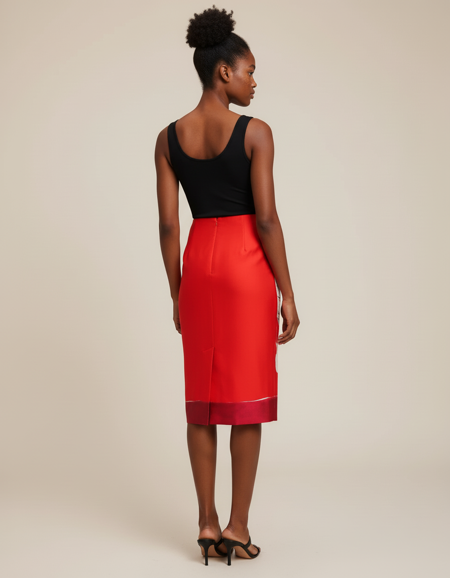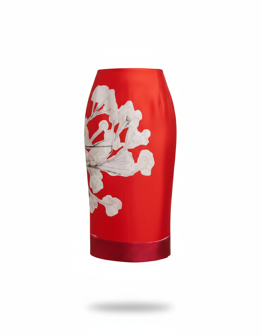 Cette jupe crayon est de couleur rouge avec un motif floral blanc imprimé sur le devant. Elle présente une bande de tissu unie rouge foncé au niveau de l'ourlet.