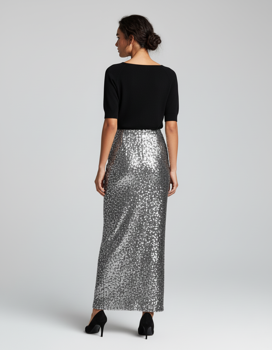 La Jupe Crayon Paillettes Argentée Chic transcende les attentes, s'affirmant comme la pièce maîtresse d'une garde-robe audacieuse. Pour une soirée glamour inoubliable, associez-la à un chemisier en soie noire fluide ou un top bustier élégant, complété par des escarpins fins et des bijoux discrets pour un impact maximal. Envie de moderniser votre allure ? Osez la porter avec un pull en maille fine, tel qu'un cachemire noir ou gris anthracite, et des bottines chic pour un dîner raffiné ou un événement de jour. Elle se prête aussi merveilleusement aux fêtes de fin d'année, illuminant chaque pas de son éclat sophistiqué.