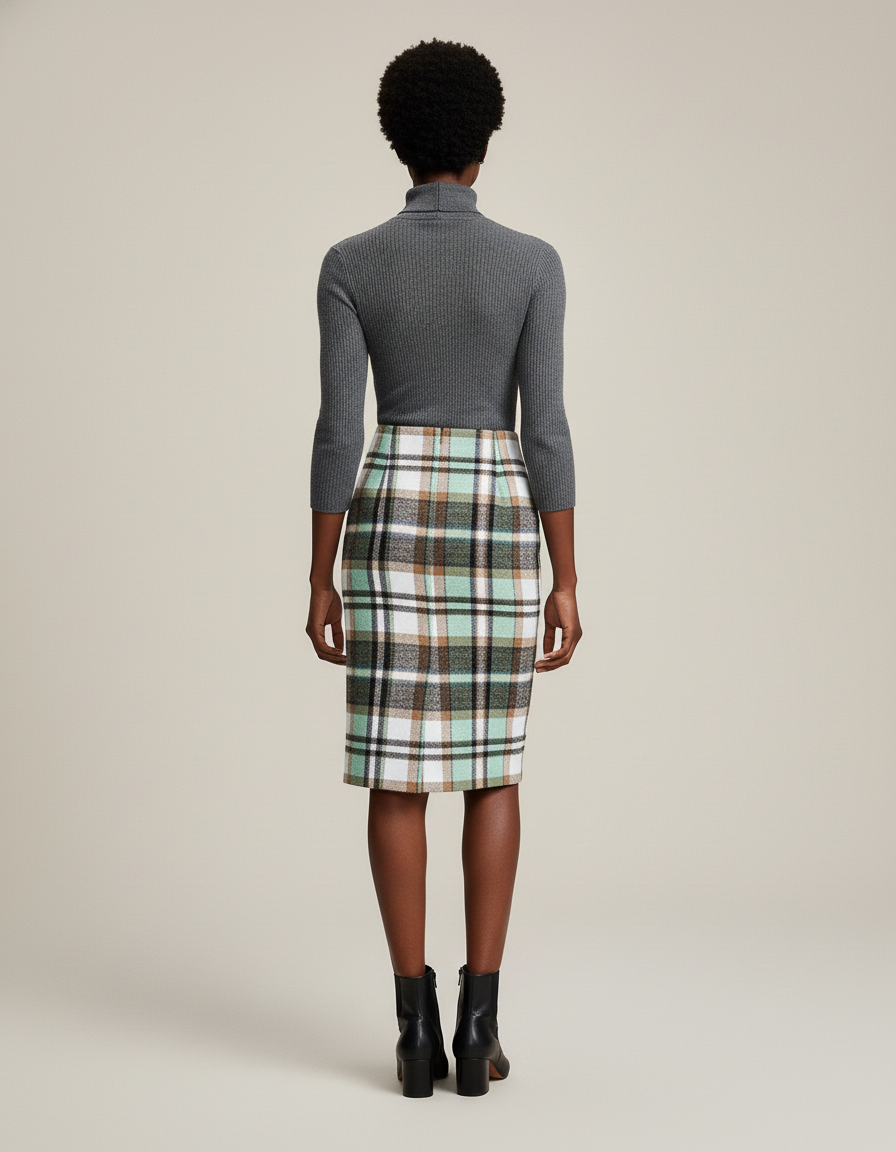 Confectionnée dans une laine de qualité supérieure, cette jupe crayon se distingue par son motif plaid unique, où les teintes de vert menthe frais se mêlent harmonieusement au blanc crème, au marron terreux et aux accents de noir. Ce mélange de couleurs audacieux et sophistiqué la démarque instantanément des classiques, apportant une modernité rafraîchissante à un design intemporel. Elle est le choix parfait pour celles qui désirent une pièce polyvalente, facile à associer, et qui incarne un luxe discret et contemporain.