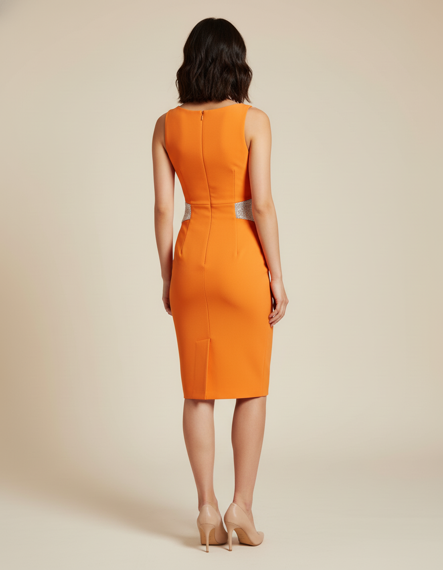 Cette robe crayon orange vif est parfaite pour une invitée de mariage, alliant élégance et une touche de glamour.
